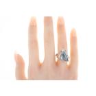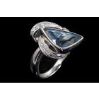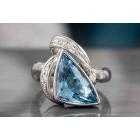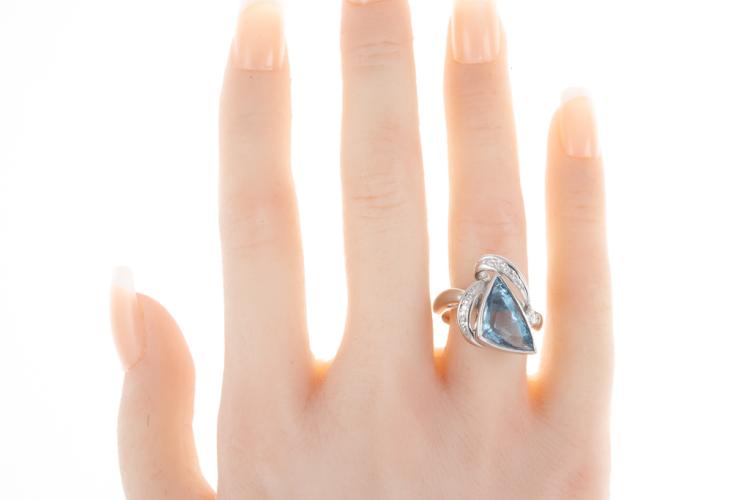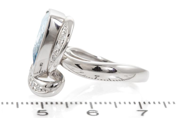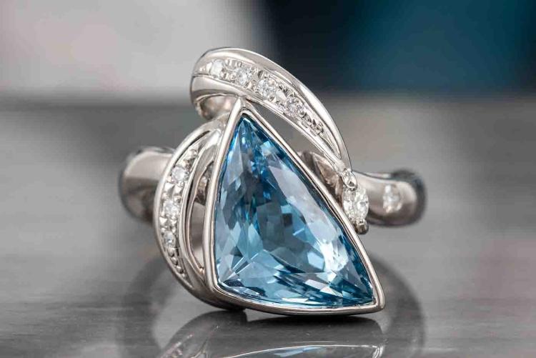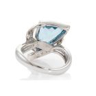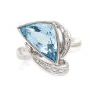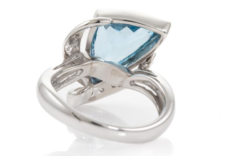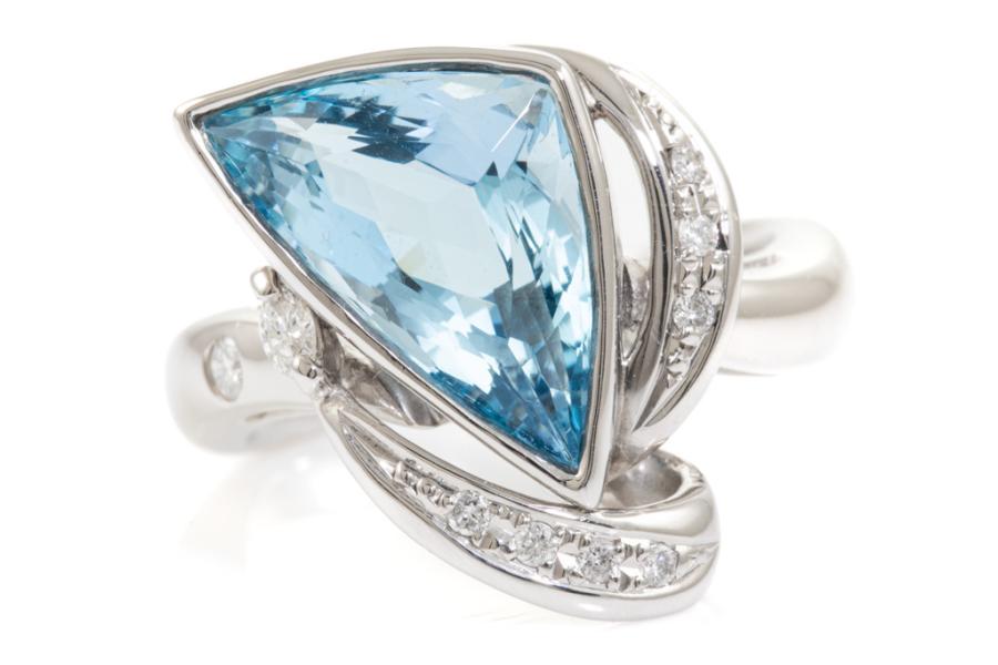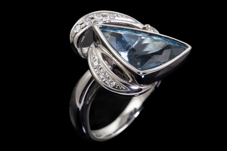 Aquamarine and Diamond ring with fancy trilliant cut Natural Aquamarine of 3.48ct and Natural Diamonds totalling 0.14ct. Platinum 900. Ring size M - ring resizing is not recommended. Weight: 10.5g (Pre-owned)
