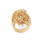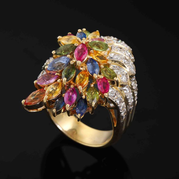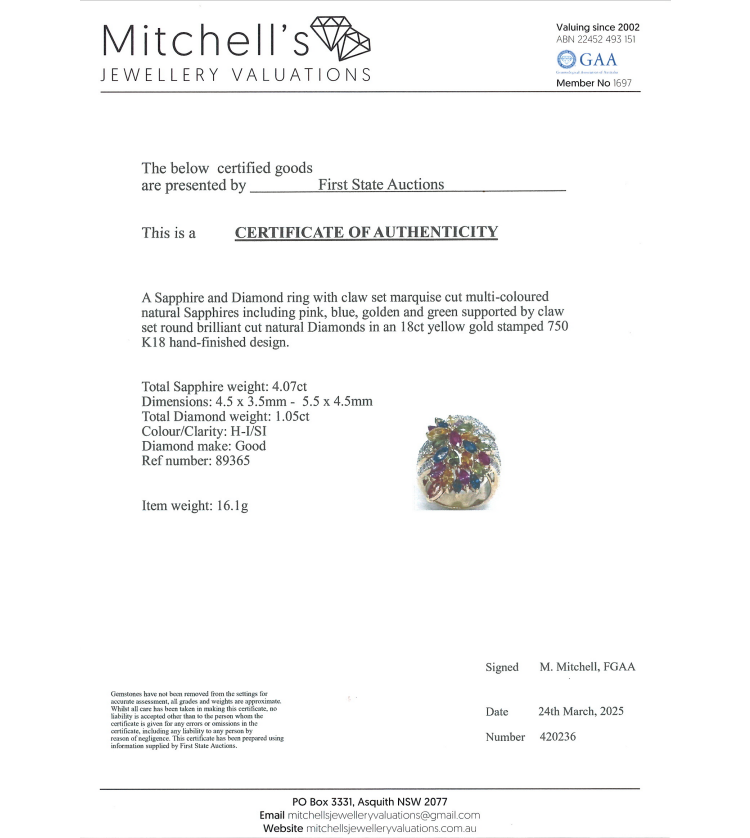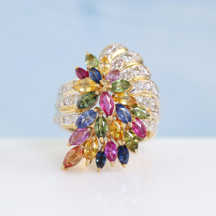 Sapphire and Diamond ring with marquise cut Natural multi-colour Sapphire totalling 4.07ct and round Natural Diamonds totalling 1.05ct (Estimated grading: H-I SI). 18ct yellow gold. Ring size K½. Band width: 5.5mm - 7mm. Weight: 16.1g. With Certificate #420236. (Pre-owned)