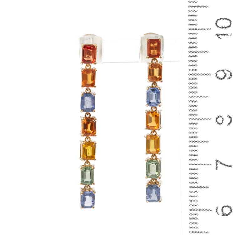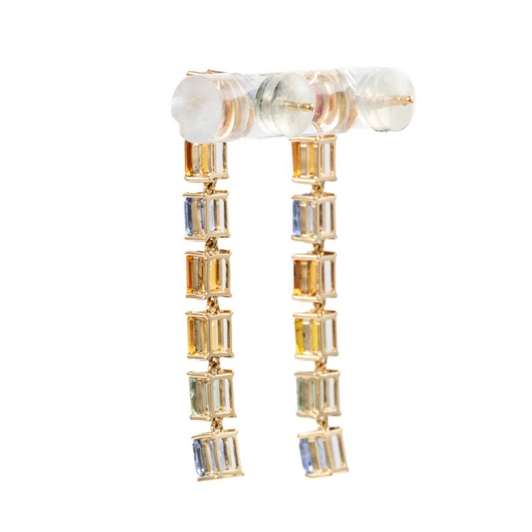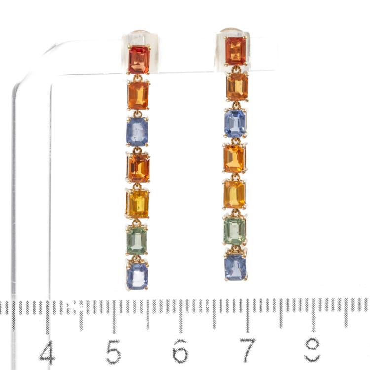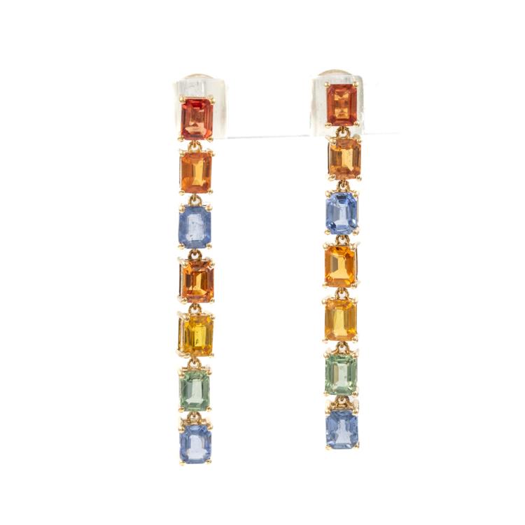 Sapphire drop earrings with emerald cut multi-colour Natural Sapphires totalling 4.20cts. 18ct yellow gold with silicon backs. Length of earring: 3.5cm. Weight: 3.2g. (Pre-owned)
