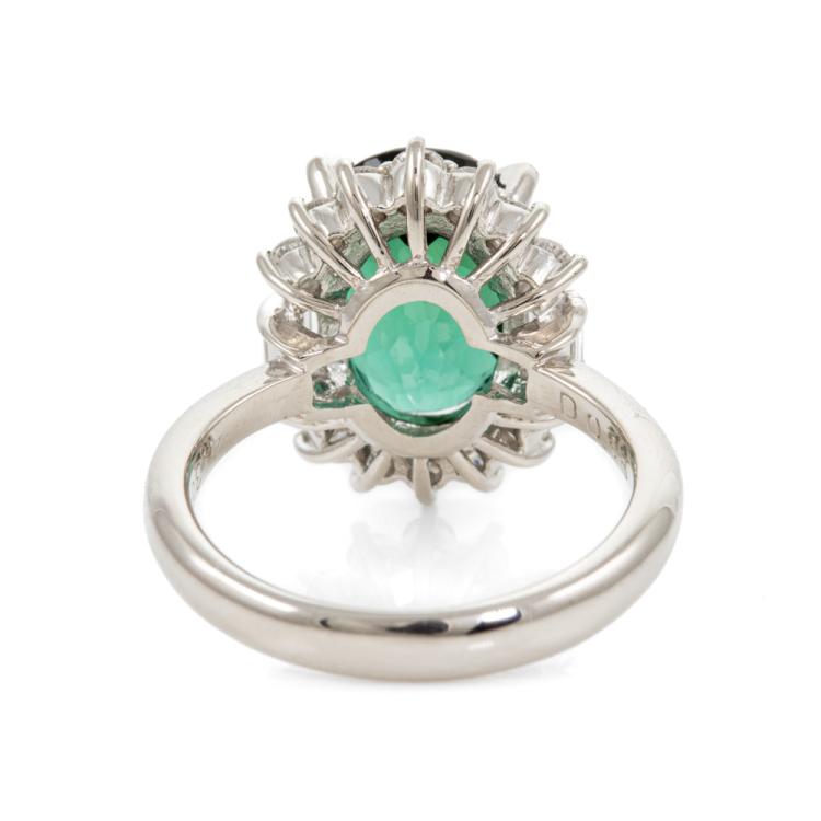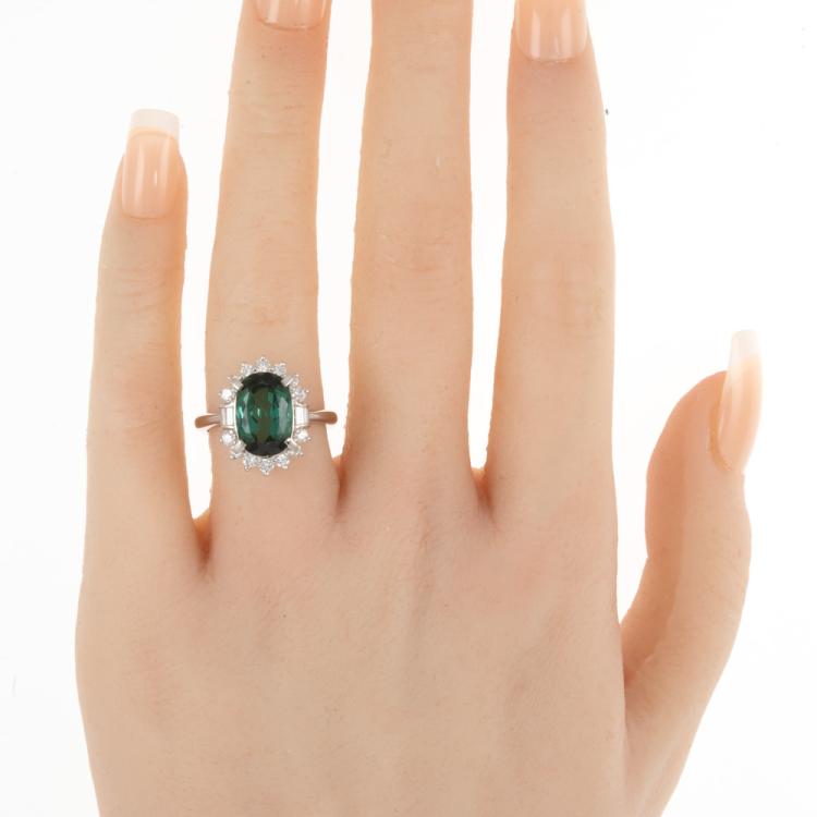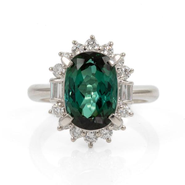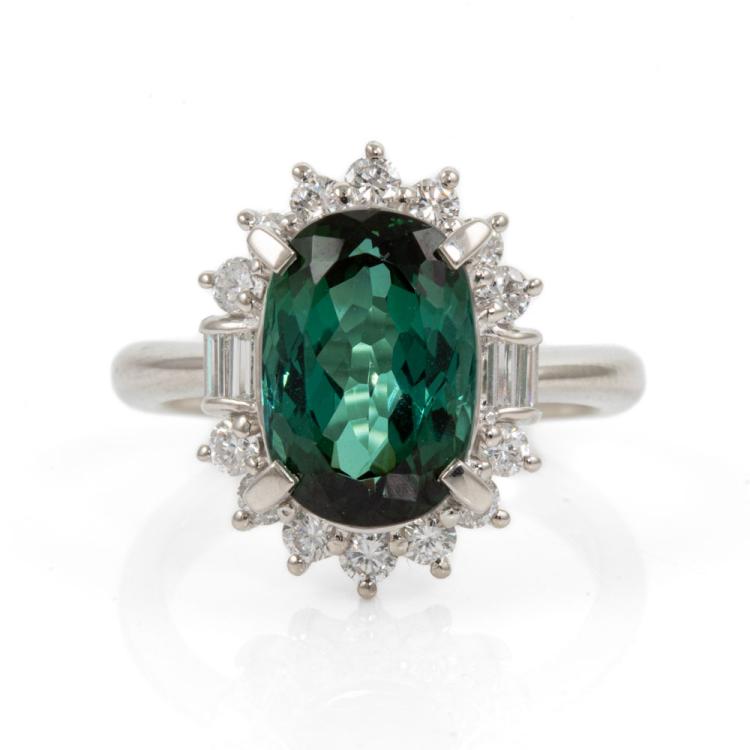 Tourmaline and Diamond ring with oval shape Natural Tourmaline of 4.38ct and round & baguette cut Natural Diamonds totalling 0.68cts (Estimated grading: G SI). Platinum 900. Ring size K. Band width: 2.9mm - 1.8mm. Weight: 8.5g. (Pre-owned)