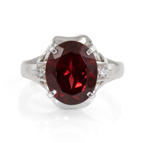 Garnet and Diamond ring with an oval shape Natural Garnet of approximately 4.80ct and 2 round Natural Diamonds totalling approximately 0.03cts. Platinum 900. Band width: 2.6mm - 3.2mm. Ring size J1/2. Weight: 7.3g. (Pre-owned)