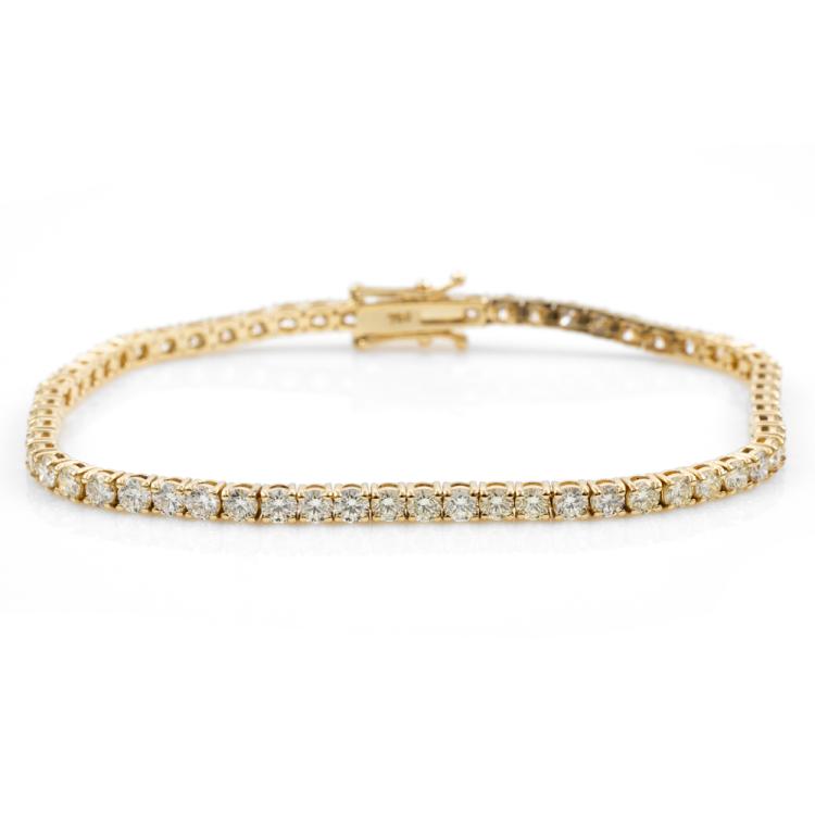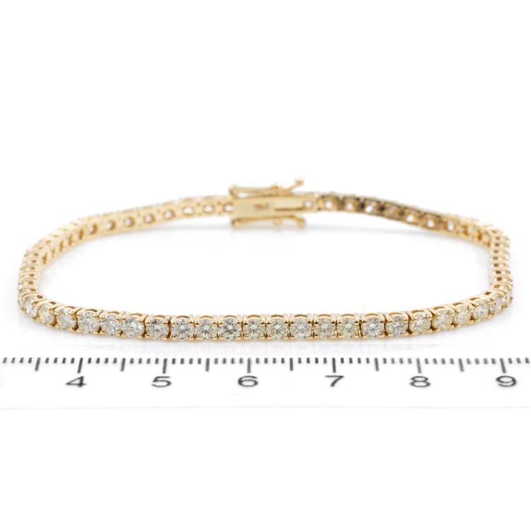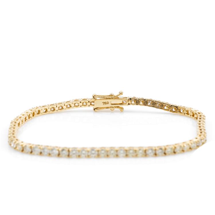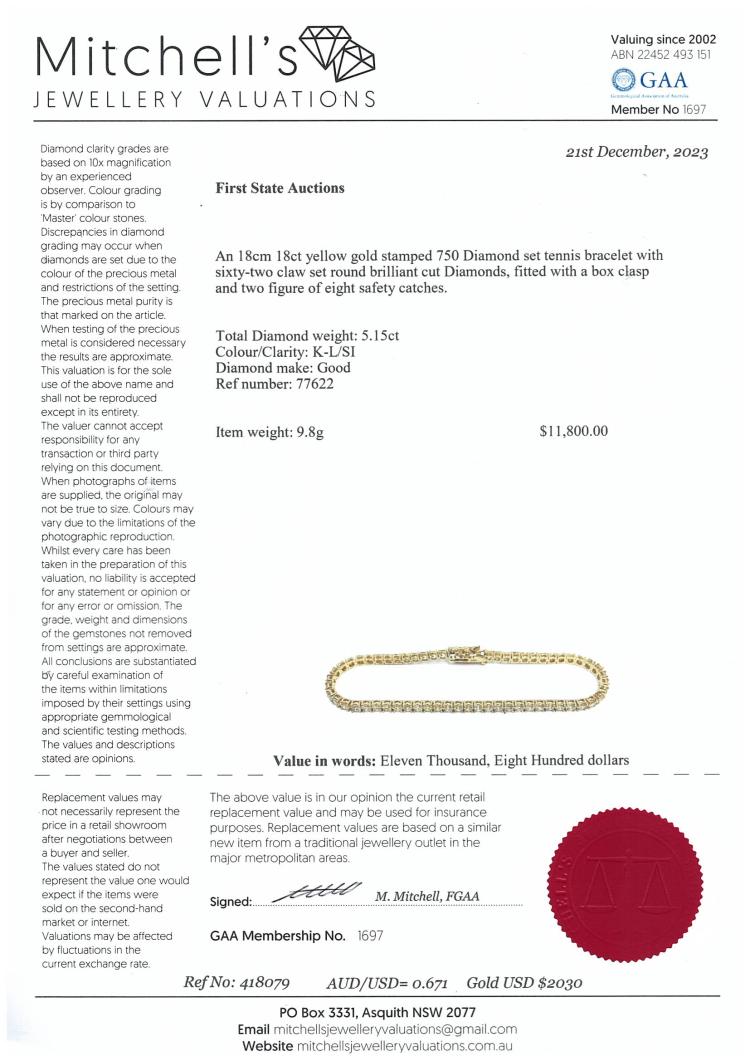 Diamond tennis bracelet with 62 round brilliant cut Natural Diamonds totalling 5.15ct. (Estimated grading: K-L SI) 18ct yellow gold. Length: 18cm. Weight: 9.8g. With Valuation Certificate #418079. (New)