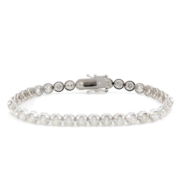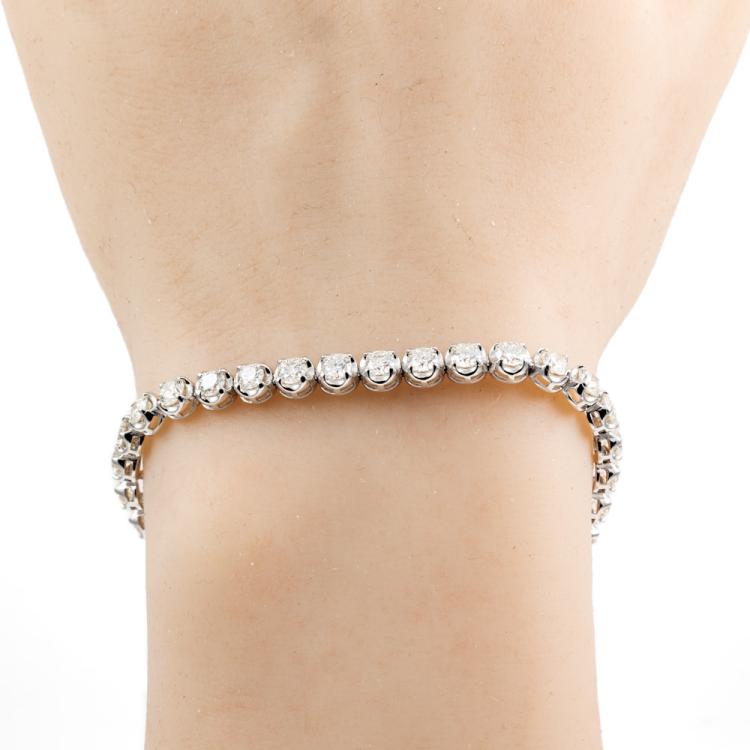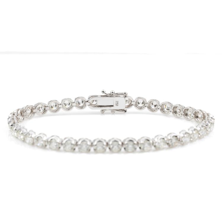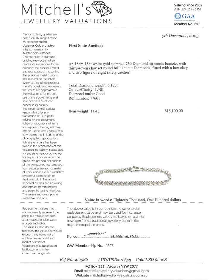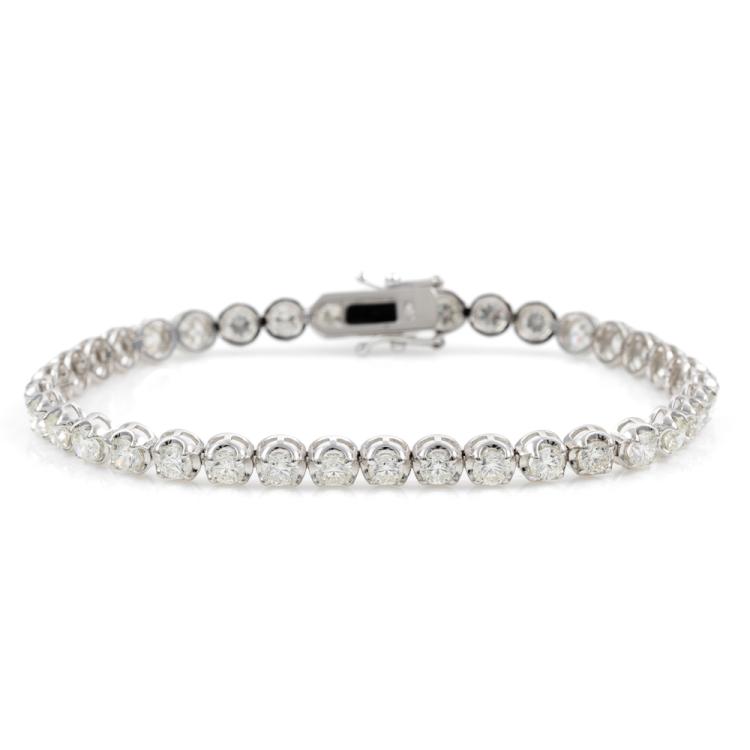 Diamond tennis bracelet with 37 round brilliant cut Natural Diamonds totalling 6.12cts. (Estimated grading: I-J SI). 18ct white gold. Length: 18cm. Weight: 11.4g. With Valuation Certificate #417986. (New)