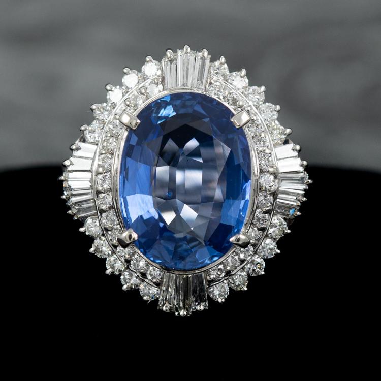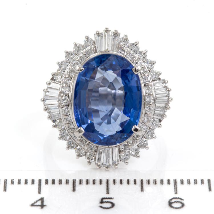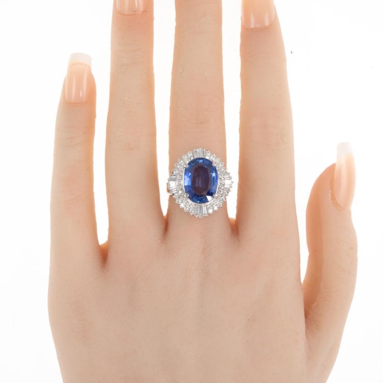 Sapphire and Diamond ring with oval shape Natural Sri Lankan cornflower blue Sapphire of 7.12ct and baguette cut & round Natural Diamonds totalling 1.15cts (Estimated grading: G-H SI). Platinum 900. Ring size L1/2. Band width: 2.7 - 4.8mm. Weight: 12.6g. With AIGS Report#GF23101885. (Pre-owned)