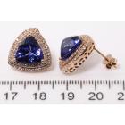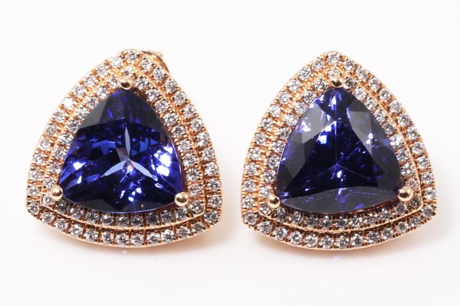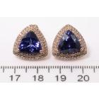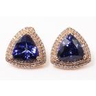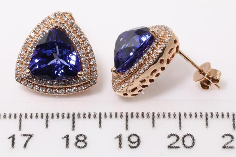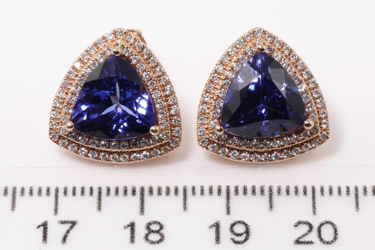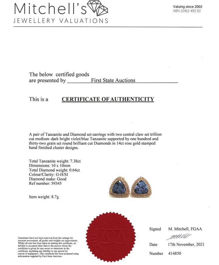 Tanzanite and Diamond earrings with trilliant cut Natural Tanzanite's totalling 7.38ct and Natural Diamonds totalling 0.64ct (Estimated grading: G-H SI). 14ct rose gold. Weight: 8.8g. With certificate #414850. (As new)