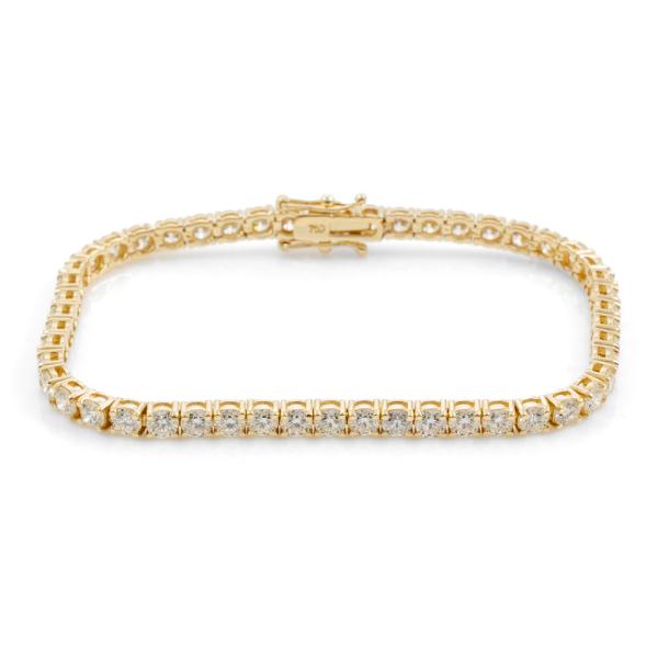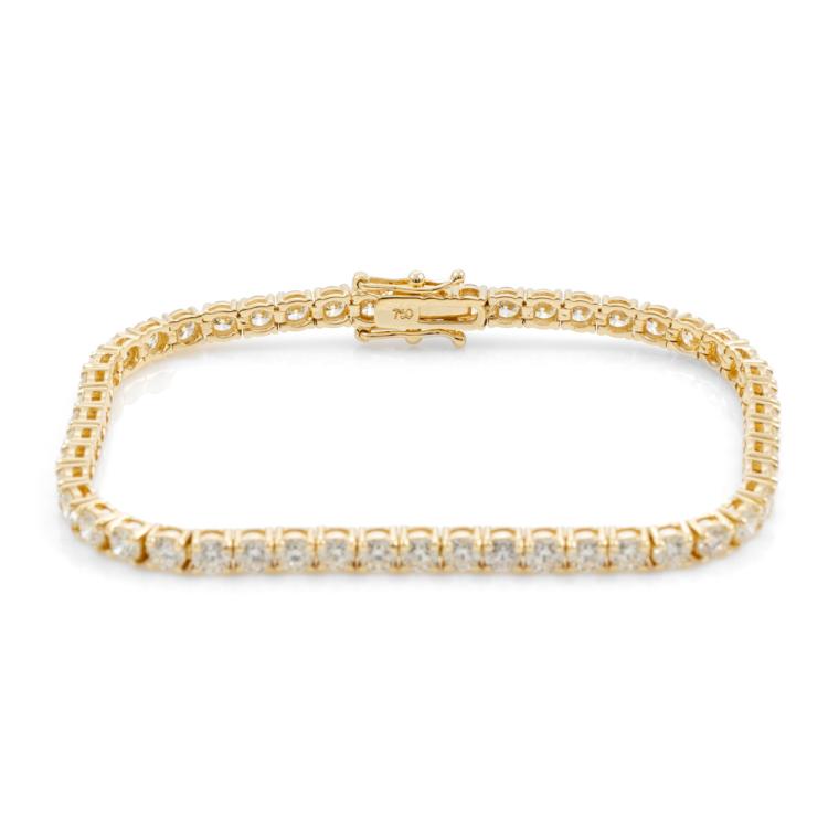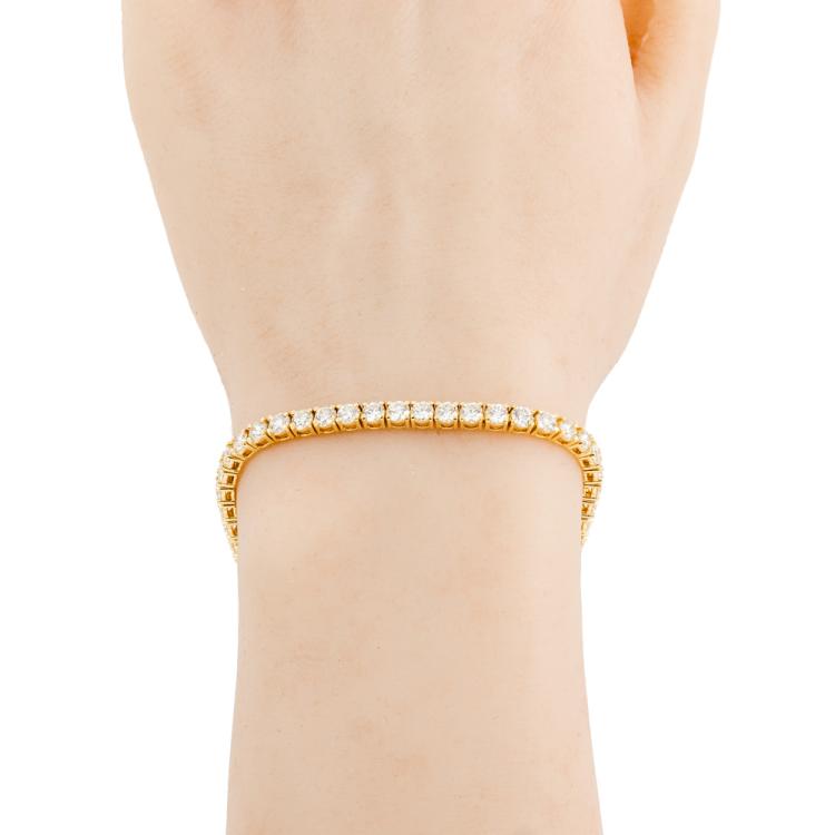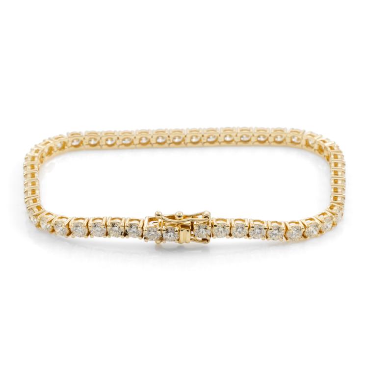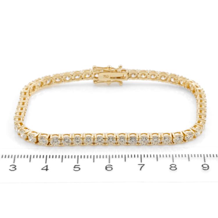 Diamond tennis bracelet with 50 round brilliant cut Natural Diamonds totalling 7.64cts (Estimated grading: J-K VS). 18ct yellow gold. Length: 18cm. Weight: 12.1g. With Valuation Certificate #418446. (New)