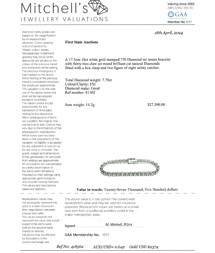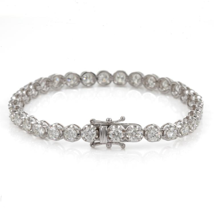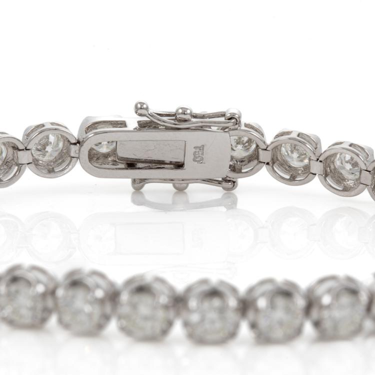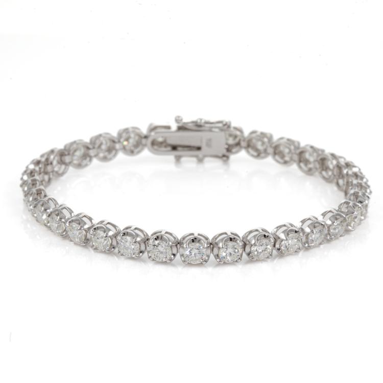 Diamond tennis bracelet with 32 round brilliant cut Natural Diamonds totalling 7.78cts (Estimated grading: I SI). 18ct white gold, length: 17.5cm. Weight: 14.2g. With Valuation Certificate #418562. (New)