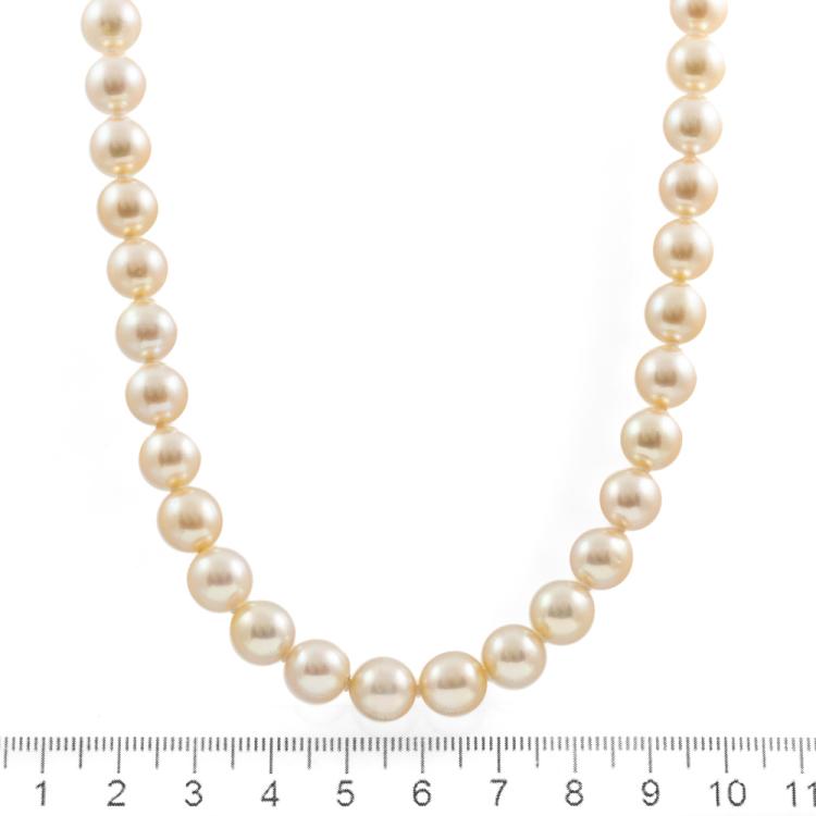 Pearl necklace with 48 Cultured Golden Pearls of 8.0mm -8.5mm. 18ct yellow gold clasp with diamonds totalling 0.06ct. Length: 46cm. Weight: 44.0g. (Pre-owned)