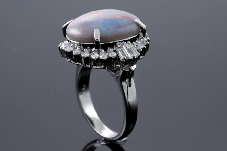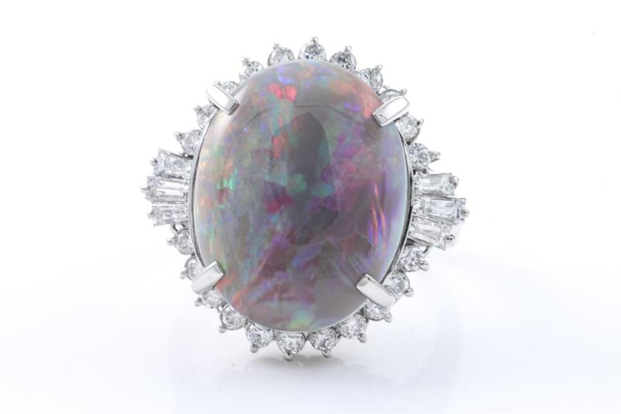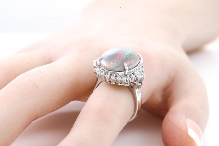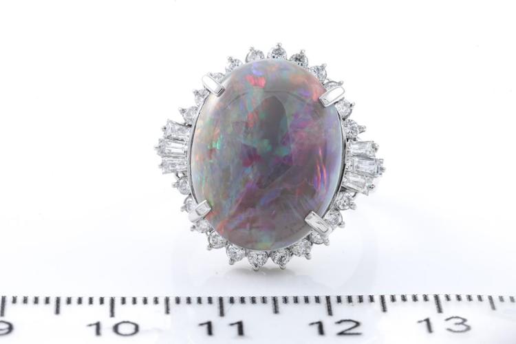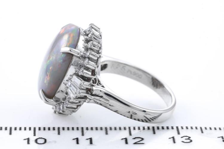 Opal and Diamond ring with an oval shape solid Black Natural Opal of 8.25ct and round & baguette cut Natural Diamonds totalling 0.90cts (Estimated grading: G-H VS-SI). Platinum-900. Ring size N. Weight: 13.4g. With Certificate #415882.