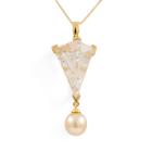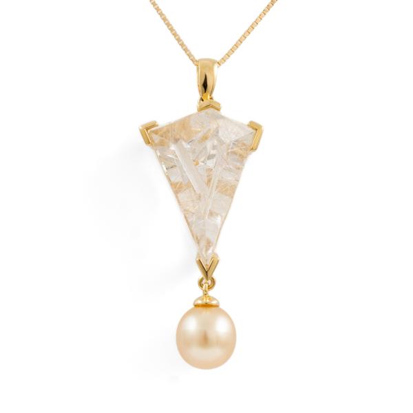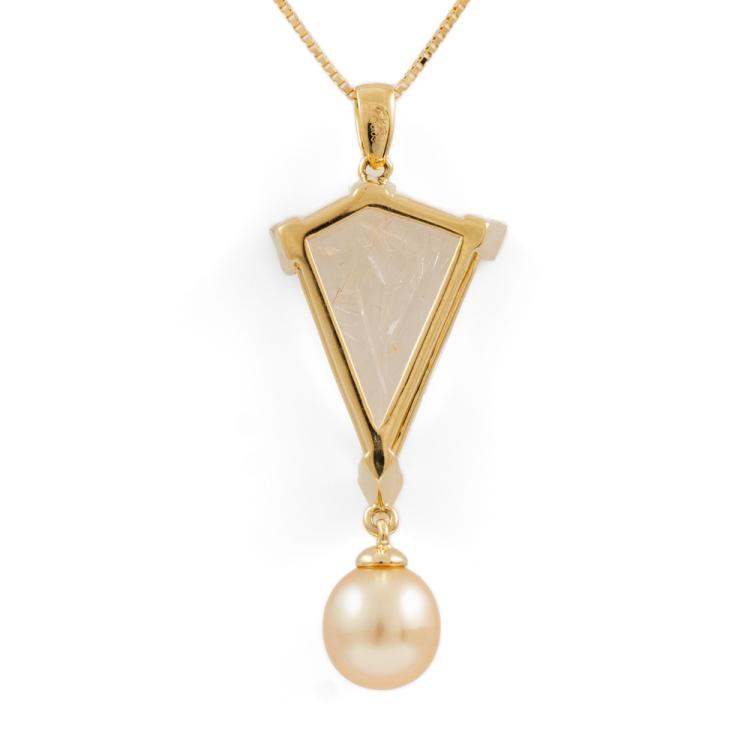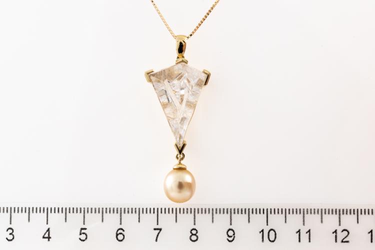 Pearl and Quartz pendant with Golden South Sea Pearl of 8.7mm and rutilated Natural Quartz of 8.03ct. 18ct yellow gold with 18ct yellow gold adjustable 44cm chain. Weight: 9.2g. (Pre-owned)6
