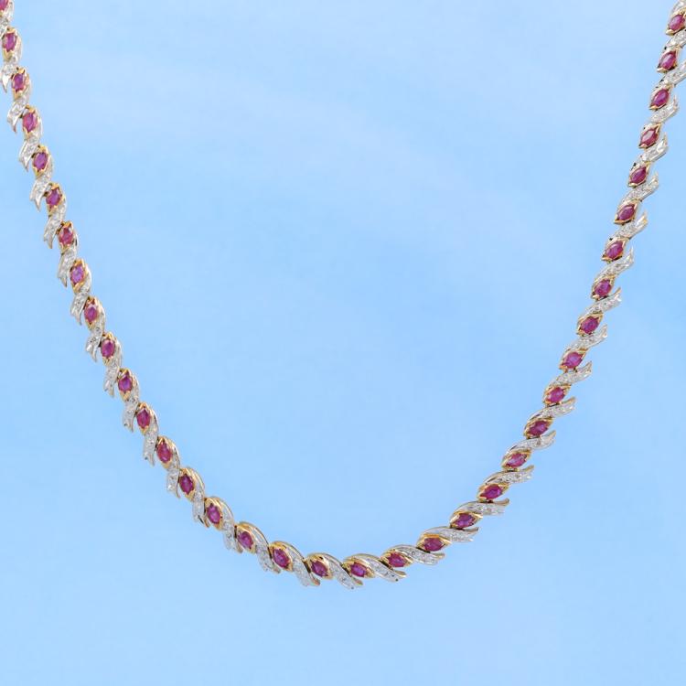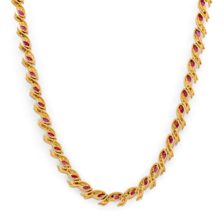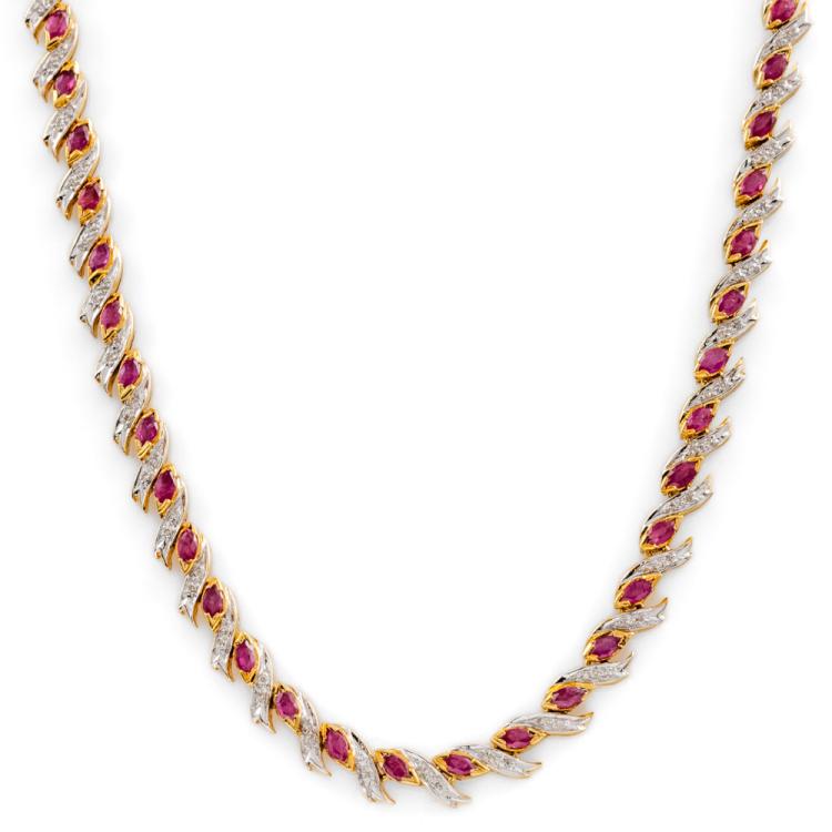 Ruby and Diamond necklace with marquise cut Natural Rubies totalling 8.80ct and round Natural Diamonds totalling 0.82ct (Estimated Grading: I-J SI). 18ct yellow gold. Length: 42cm. Weight: 30.4g. With certificate #419086. (Pre-owned)