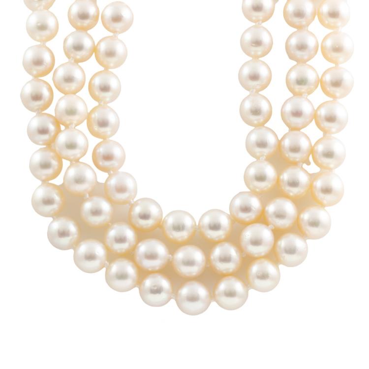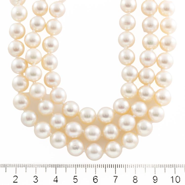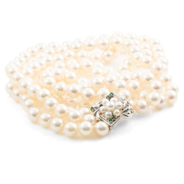 Pearl 3 row necklace with Akoya pearls of 8.5mm-9mm. 14ct white gold clasp set with round Natural Emeralds totalling approximately 0.15cts and cultured pearls of 4.5mm-5mm. Length: 44cm. Weight: 137.5g. (Pre-owned)