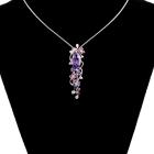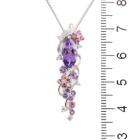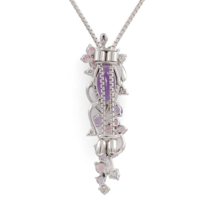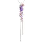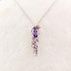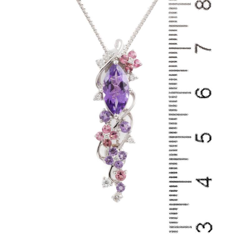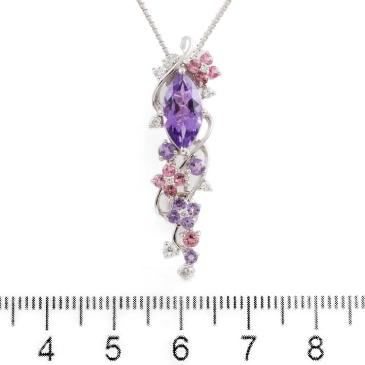 Amethyst, Tourmaline, & Diamond lariat pendant with round & marquise cut Natural Amethysts totalling 1.31cts, round pink Natural Tourmaline totalling 0.20cts, and round Natural Diamonds totalling 0.14cts. 18ct white gold with 18ct white gold 76cm adjustable chain. Weight: 9.2g. (Pre-owned)