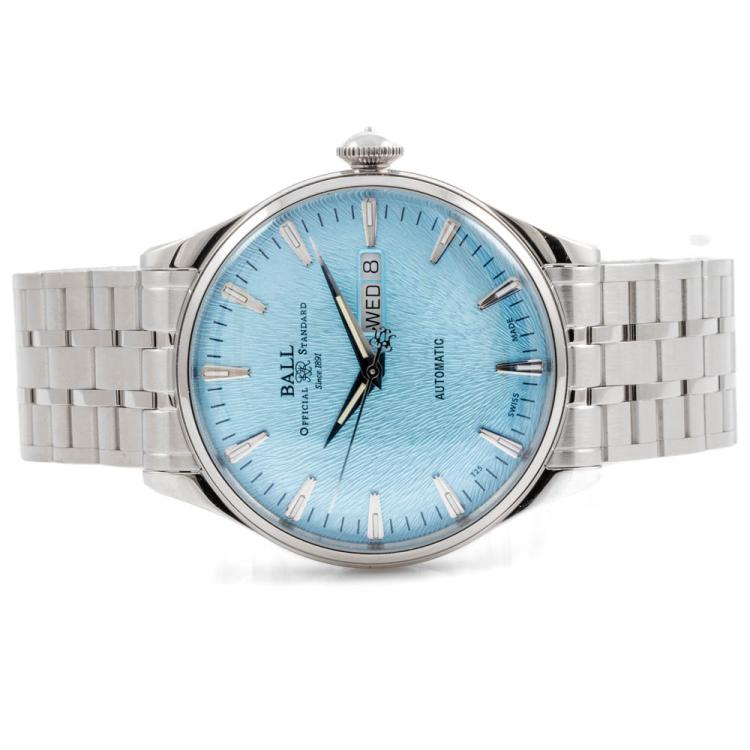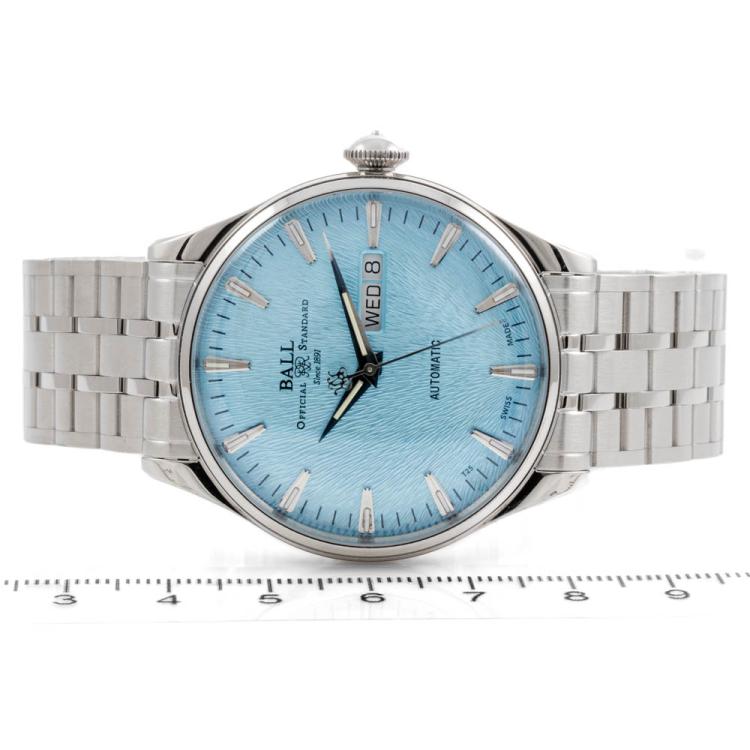 Ball Trainmaster Eternity stainless steel automatic mens watch. Ice blue dial, day & date, case diameter: 39mm, wrist size: 19.5cm, Swiss made. Ref# NM2080D-S2J-IBE. With Ball stainless steel bracelet and clasp. With Ball Premium International Warranty Certificate card and Ball box. 12 month FSA warranty (As new, Note: case and bracelet on original wrapping)