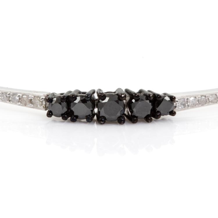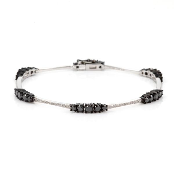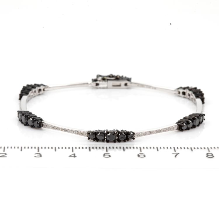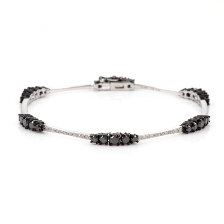 Diamond bracelet with round Black treated Diamonds totalling 2.55cts with black rhodium plating and round Natural White Diamonds totalling 0.40cts (Estimated grading: I-J P3). 18ct white gold. Length: 17.5cm. Weight: 10.4g. (Pre-owned)