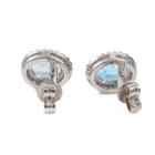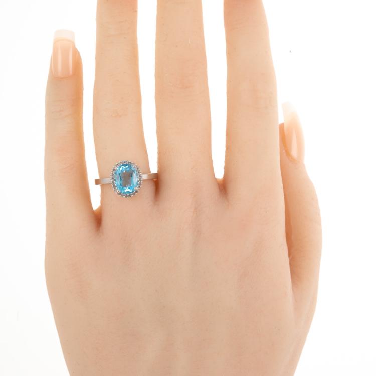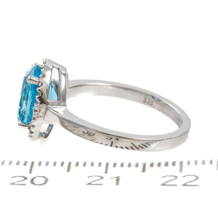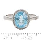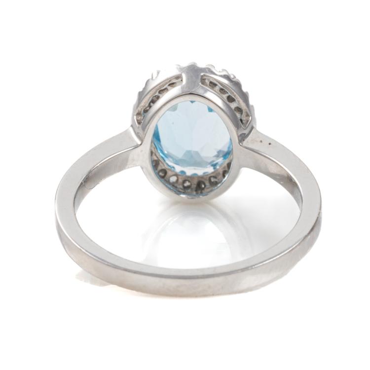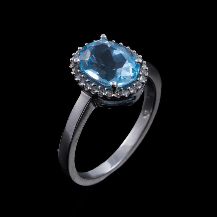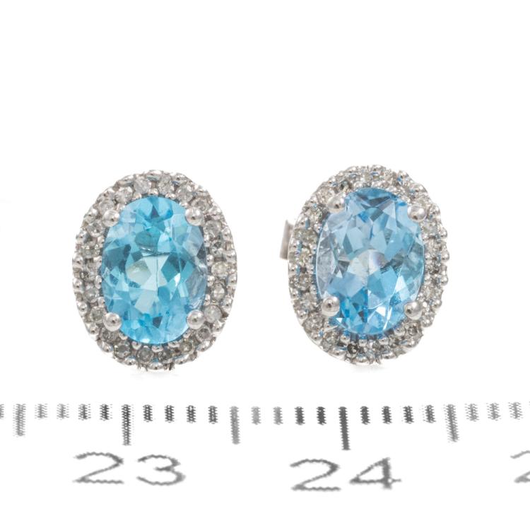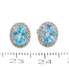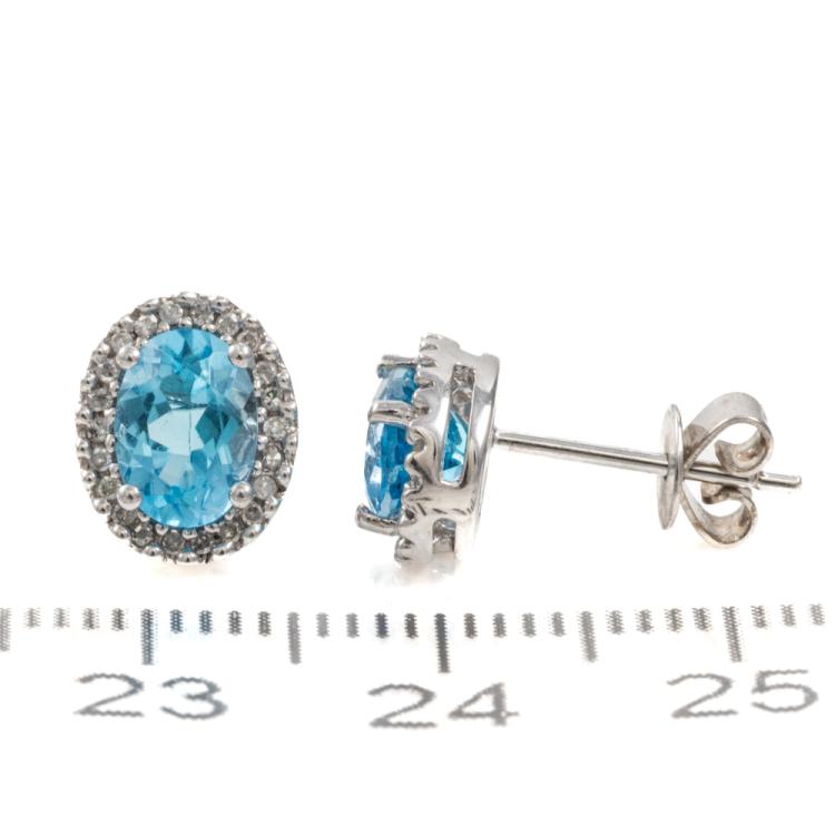 Two piece Topaz set with a Topaz & Diamond ring and Topaz & Diamond earrings. 1) Topaz ring with centre oval blue Natural Topaz of approx. 1.90cts & round Natural Diamonds totalling 0.10cts. Ring size M. Band width: 1.8mm. 2) Topaz & Diamond earrings with oval blue Natural Topaz totalling approx. 1.50cts & round Natural Diamonds of 0.15cts. Both 9ct white gold. Combined weight: 5.0g (As new)