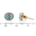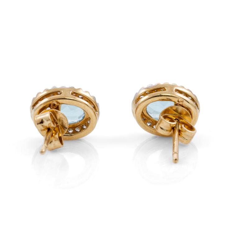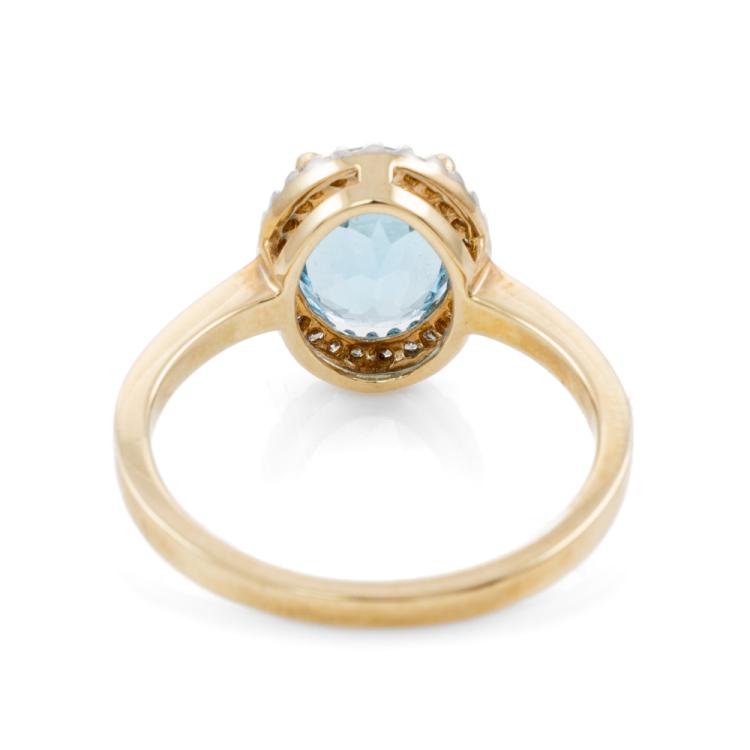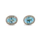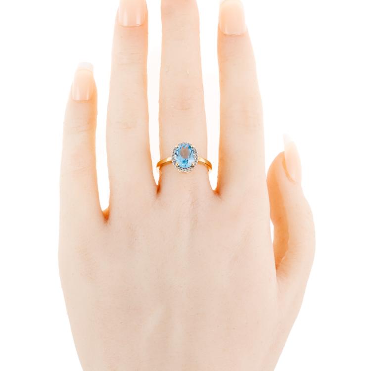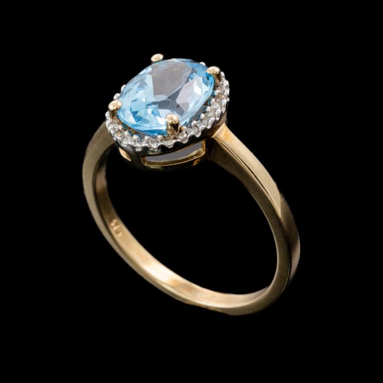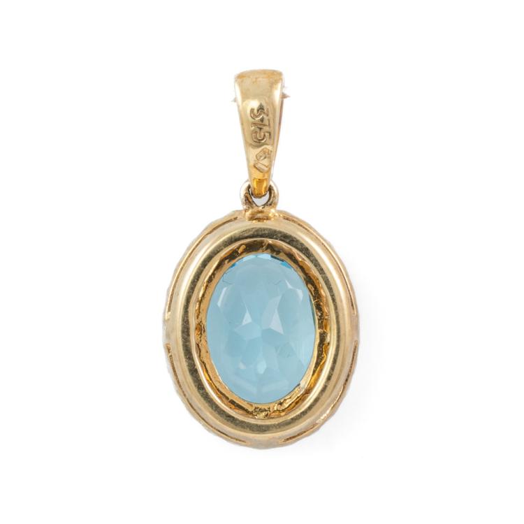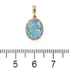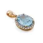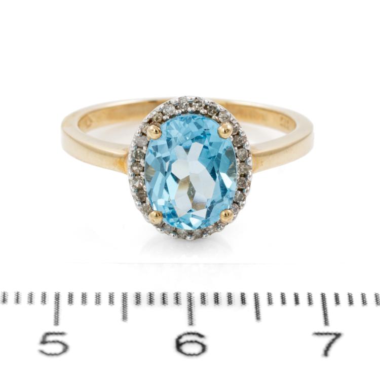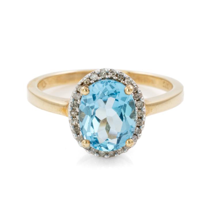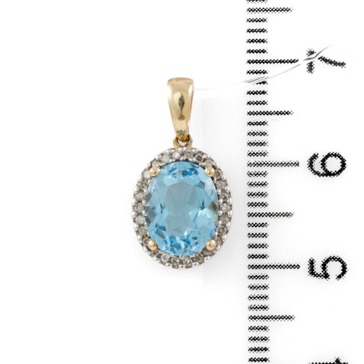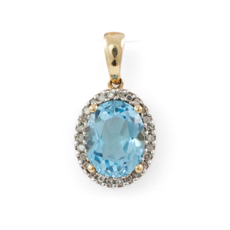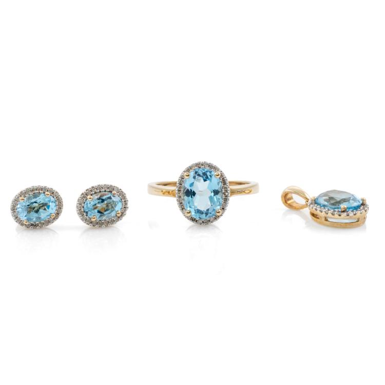 Three piece Topaz set: 1) Topaz ring with centre oval blue Natural Topaz of approx. 1.90ct & round Natural Diamonds totalling 0.10cts. Ring size O. Band width: 1.8mm. 2) Topaz stud earrings with oval Natural Topaz totalling approx. 1.50ct & round Natural Diamonds totalling 0.15cts. 3) Topaz pendant with oval Natural Topaz of approx. 2.00cts & round Natural Diamonds totalling 0.10cts, No chain provided. All 9ct yellow gold. Combined weight: 6.3g (As new)^