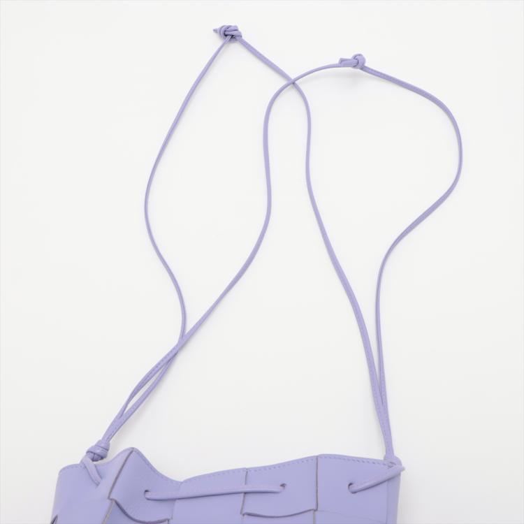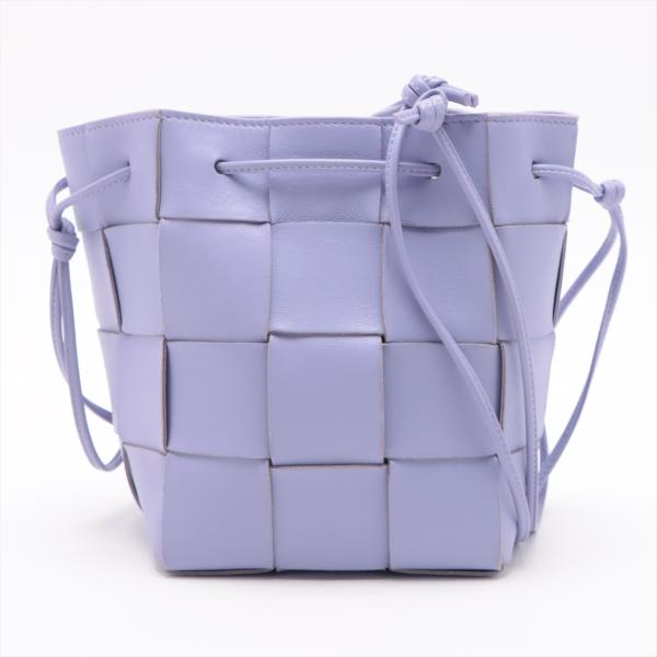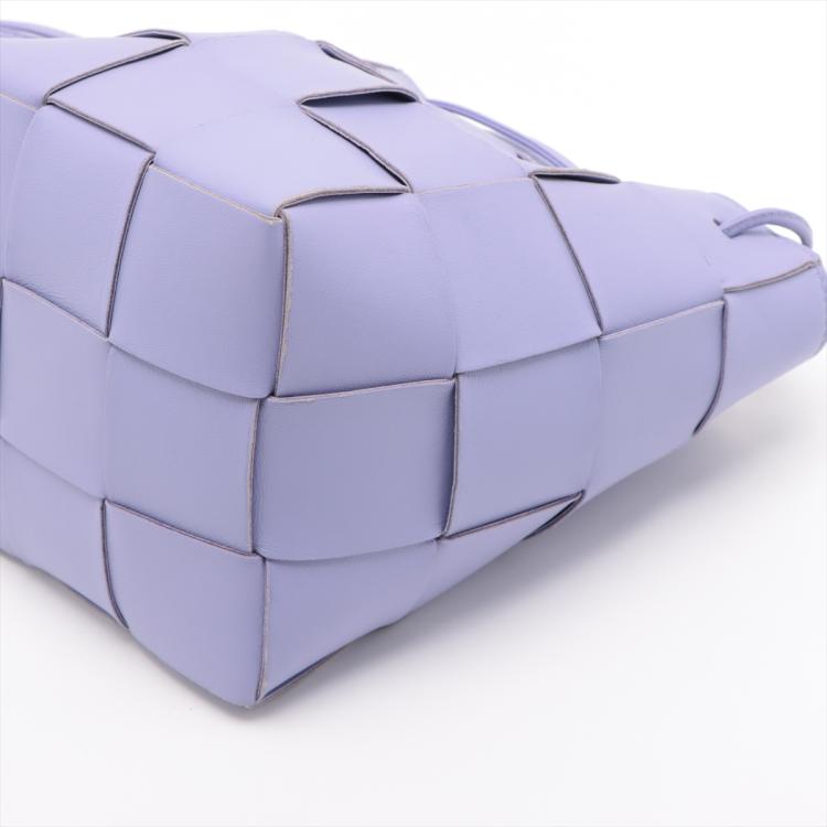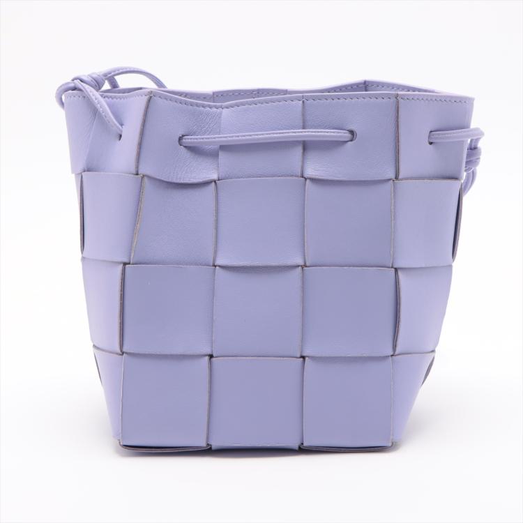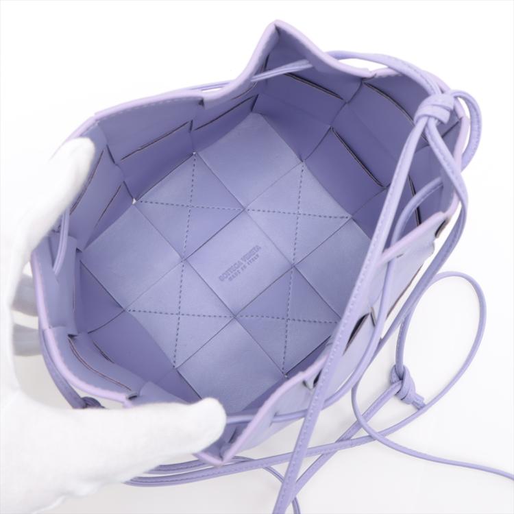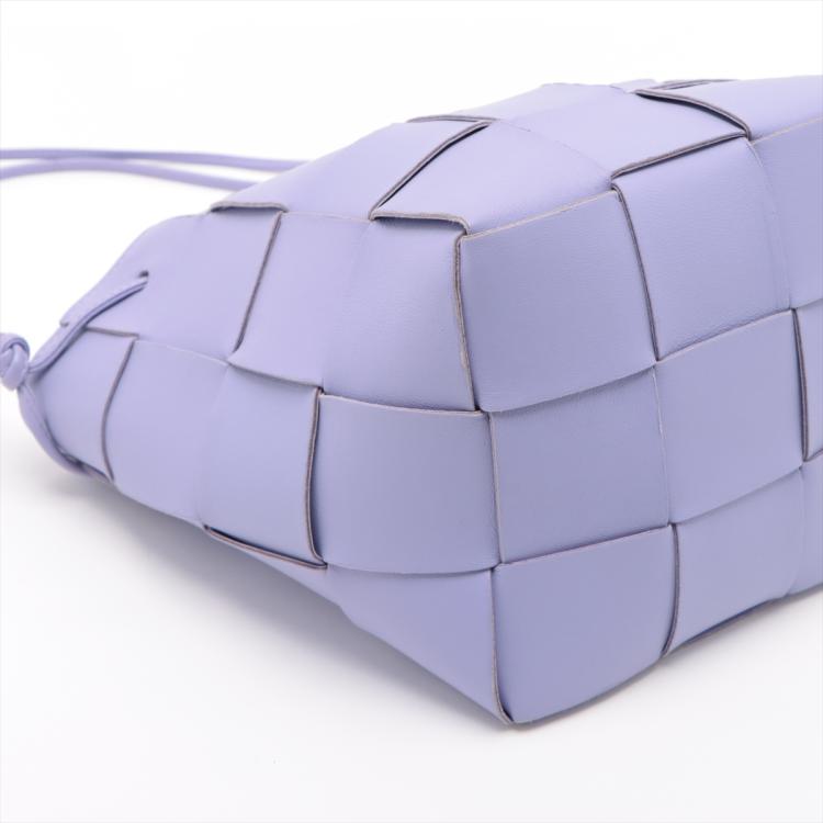 Bottega Veneta small Cassette bucket bag in Maxi Intrecciato nappa leather in lavender purple colour. Featuring a top cinch cord that extends into a thin leather shoulder strap, and the top is open to a matching colour leather interior. Approximate dimensions: 14cm(W) x 18cm(H) x 13cm(D), 45.5cm shoulder drop. Accompanied by BV dust bag. With Entrupy Certificate of Authenticity. (Pre-owned)