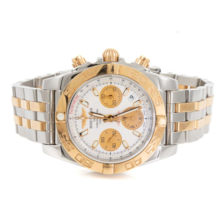 Breitling Chronomat 18ct rose gold and stainless steel automatic mens watch. Silver chronograph dial, date, case diameter: 41mm, wrist size: 20.5cm, Swiss made. Ref# CB014012/G713. With Breitling two-tone bracelet and clasp. With Certificate of Authenticity, Breitling e-warranty card dated 22/03/2020 and Breitling box. 3 month FSA warranty (Pre-owned)