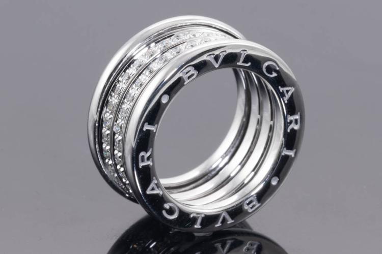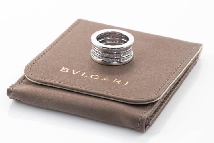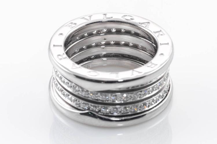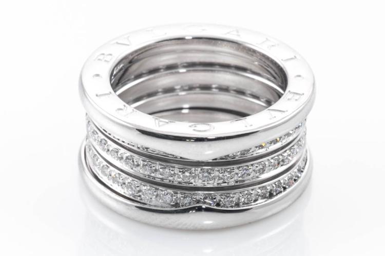 Bvlgari B.Zero1 full hoop Diamond four-band ring with round Natural Diamonds totalling 0.95ct (Estimated grading: F VS). 18ct white gold. Bvlgari stamped size 50, actual size J - ring resizing is not recommended. Made in Italy. Width: 10mm. Weight: 11.6g. With Bvlgari polishing invoice dated 27/3/2023. With Bvlgari pouch. (Pre-owned)