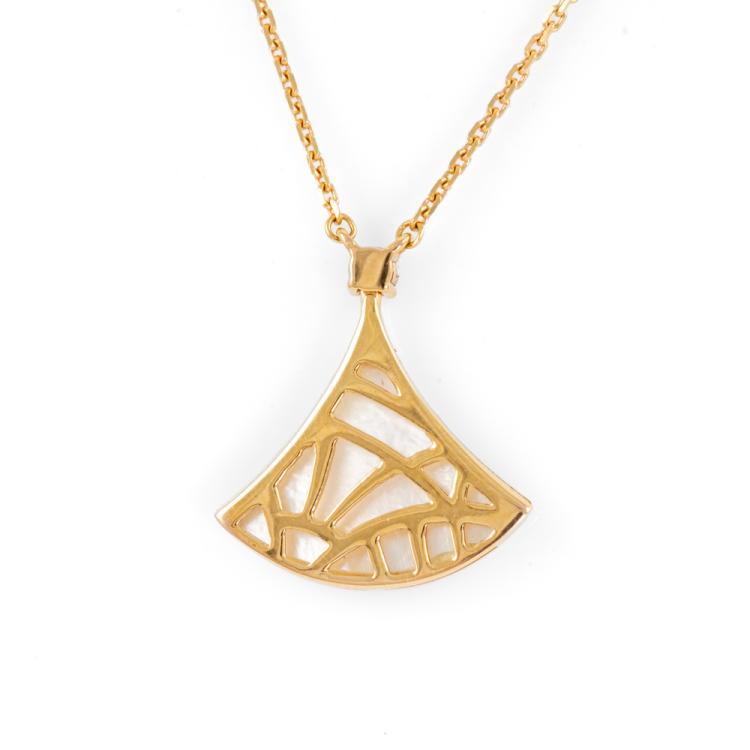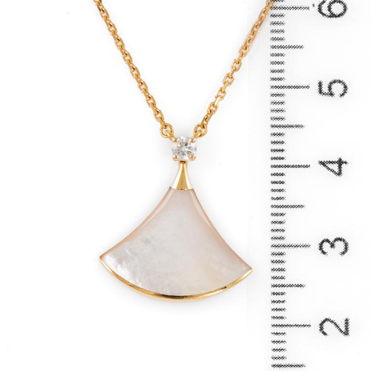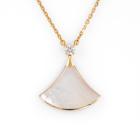 Bvlgari Divas Dream Necklace with white Mother of Pearl (note minor surface wear) a round Diamond of approximately 0.10ct. Motif size 21mm x 19.3mm. 18ct yellow gold with 18ct yellow gold adjustable Bvlgari 41cm chain. Made in Italy. Weight: 5.5g. (Pre-owned)