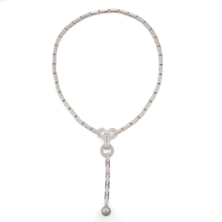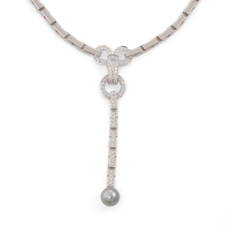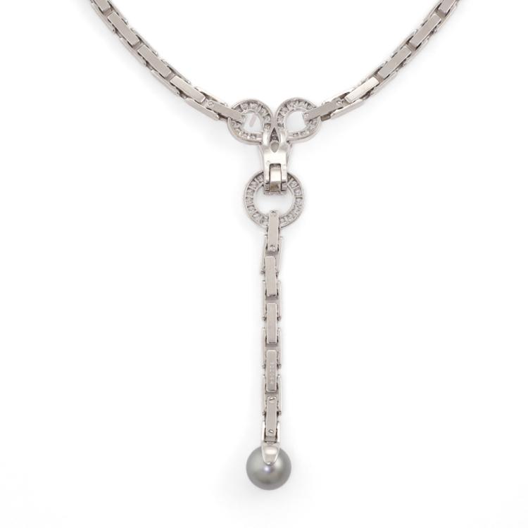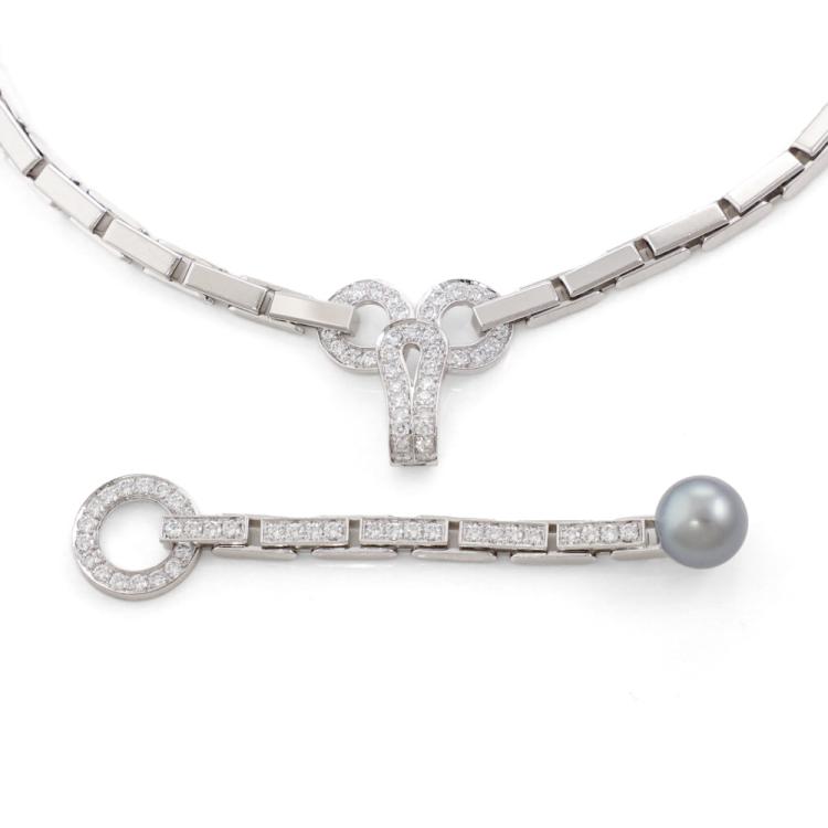 Cartier Diamond and Pearl Agrafe detachable necklace with Tahitian Pearl of 10.4mm and round Natural Diamonds totalling approximately 3.00ct (Estimated grading: F VS). 18ct white gold. Length: 42cm. Detachable motif length: 7.5cm. Weight: 78.1g. With Cartier Service Receipt dated 27/03/25. (Pre-owned)