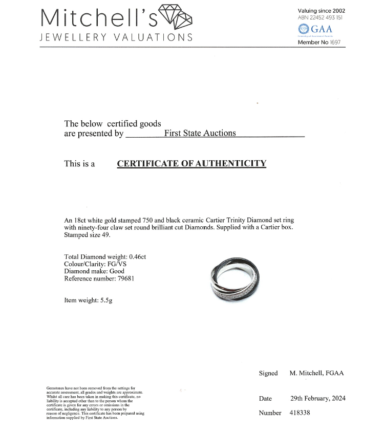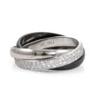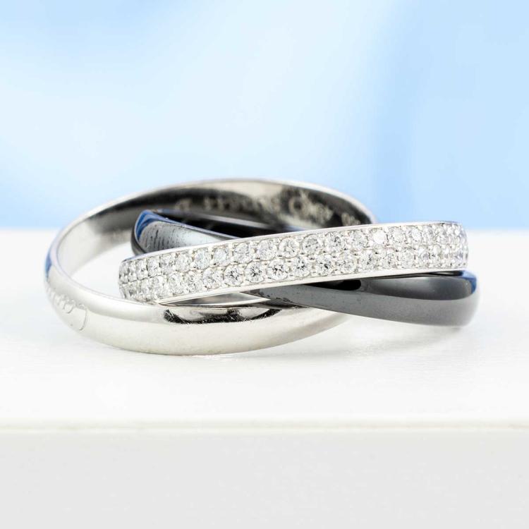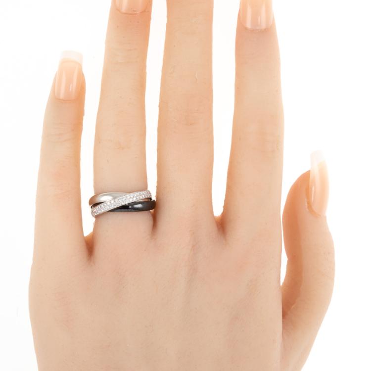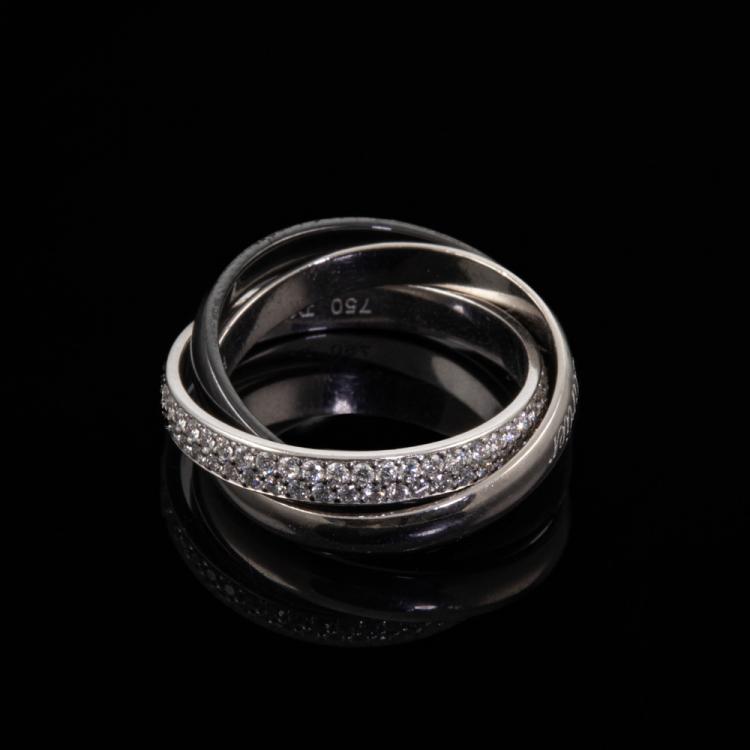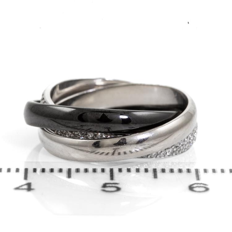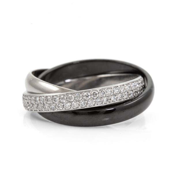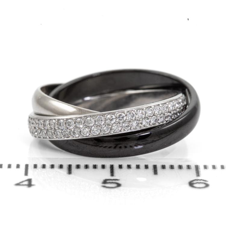 Cartier Trinity ring in Ceramic, small model with round Natural Diamonds totalling 0.46cts (Estimated grading: F-G VS). 18ct white gold, platinum 950 and ceramic. Stamped size 49, J1/2- ring resizing is not recommended. Band width of one ring: 2.9mm. Weight: 5.5g. With Cartier box. With Certificate #418338. (Pre-owned)