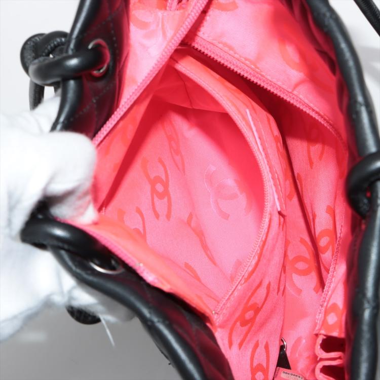 Chanel Cambon Ligne tote bag in black lambskin leather. Featuring silver-toned hardware, a rear patch pocket, signature interlocking CC logo on front, circular top handles with knot detail. The open top opens to a hot pink, logo printed fabric lining interior with a zip pocket. Approximate dimensions: 20cm x 24cm(H) x 11.5cm(D), 17.5cm handle height. Accompanied by certificate card. With Entrupy Certificate of Authenticity. (Pre-owned)