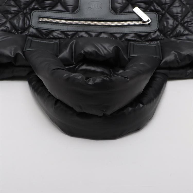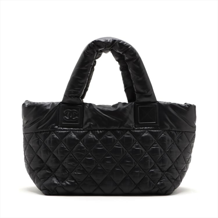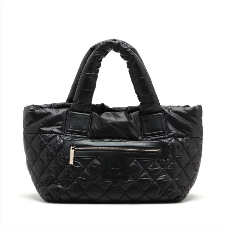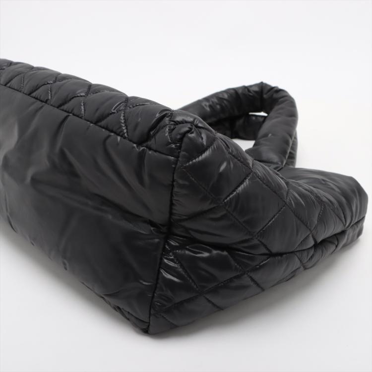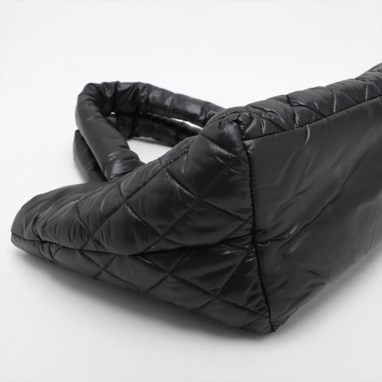 Chanel Coco Cocoon tote bag in black padded soft diamond quilted nylon. Featuring padded top handles, a facing zipper pocket with Chanel CC logo stamped, silver-toned hardware, open top with a hook closure. The top opens to a burgundy nylon interior with a zipped pocket. Approximate dimensions: 28.5cm(L) x 23cm(H) x 16cm(D), 13cm handle drop. With Entrupy Certificate of Authenticity. (Pre-owned)