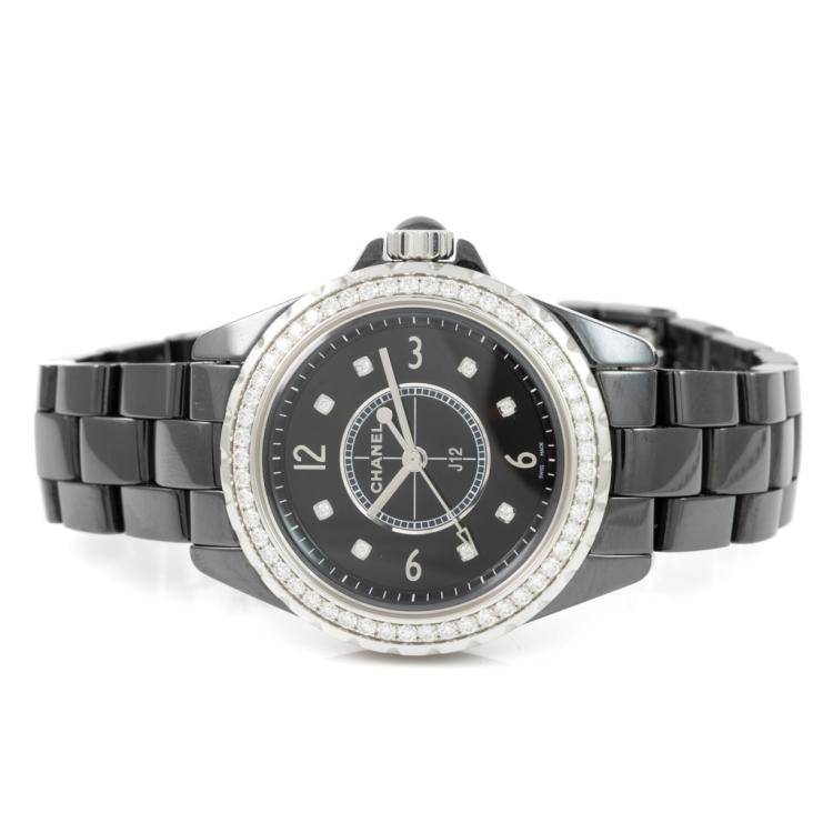 Chanel J12 ceramic quartz ladies watch. Black dial, Diamond indicators, Diamond set bezel, case diameter: 33mm, wrist size: 17cm, Swiss made. Ref# H3108. With Chanel Black ceramic bracelet and clasp. With Certificate of Authenticity, Undated Chanel Certificate of Authenticity & Chanel International Booklet and Chanel box. 3 month FSA warranty (Pre-owned)