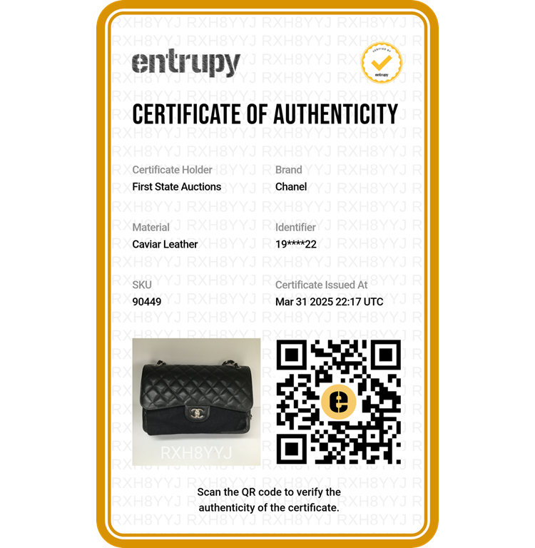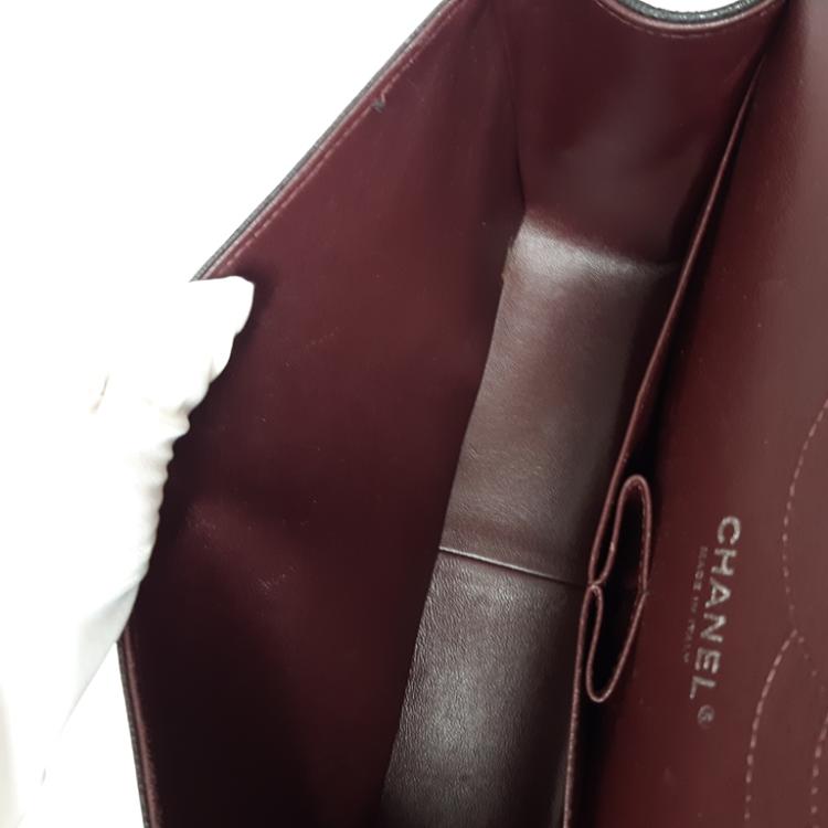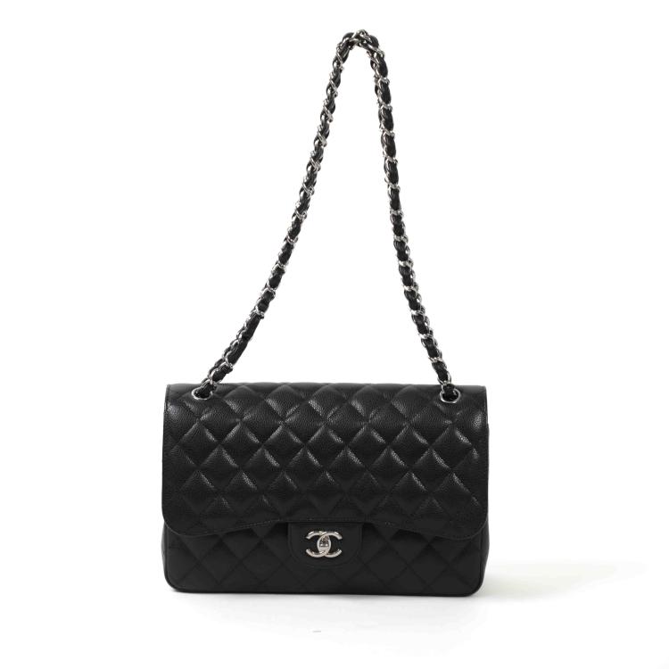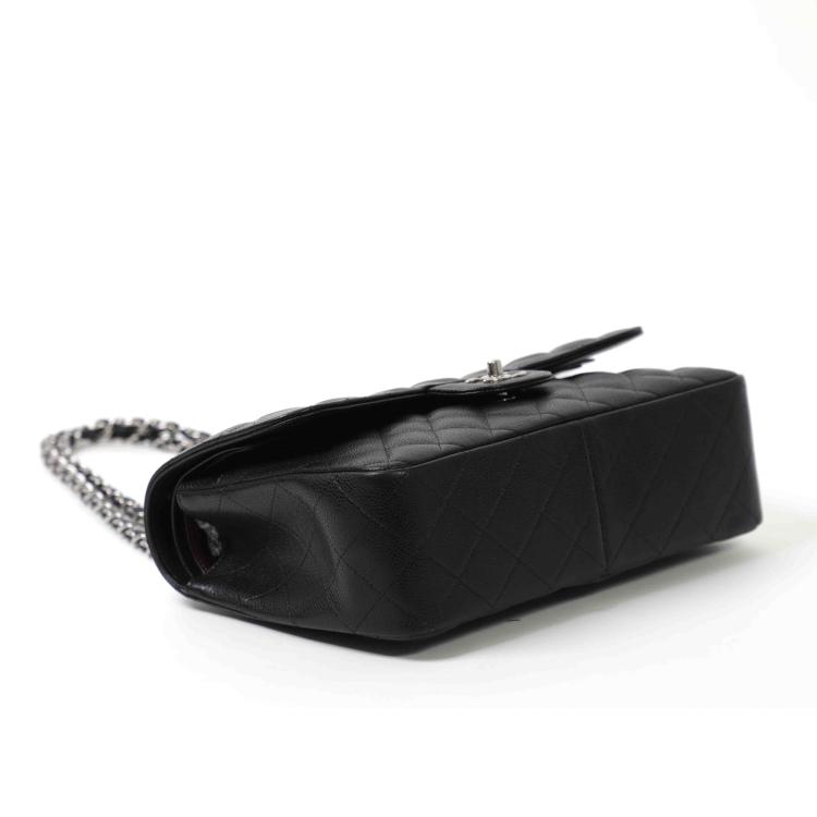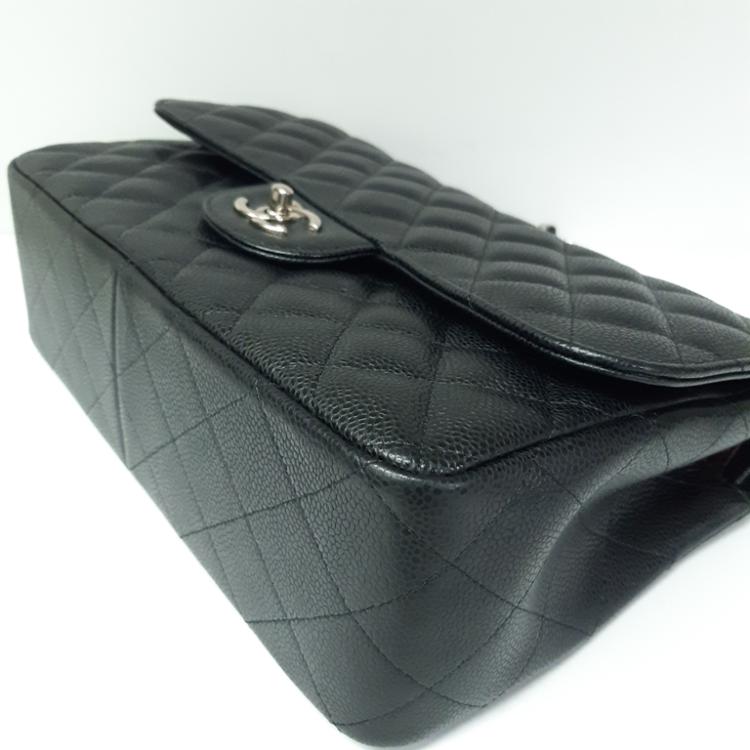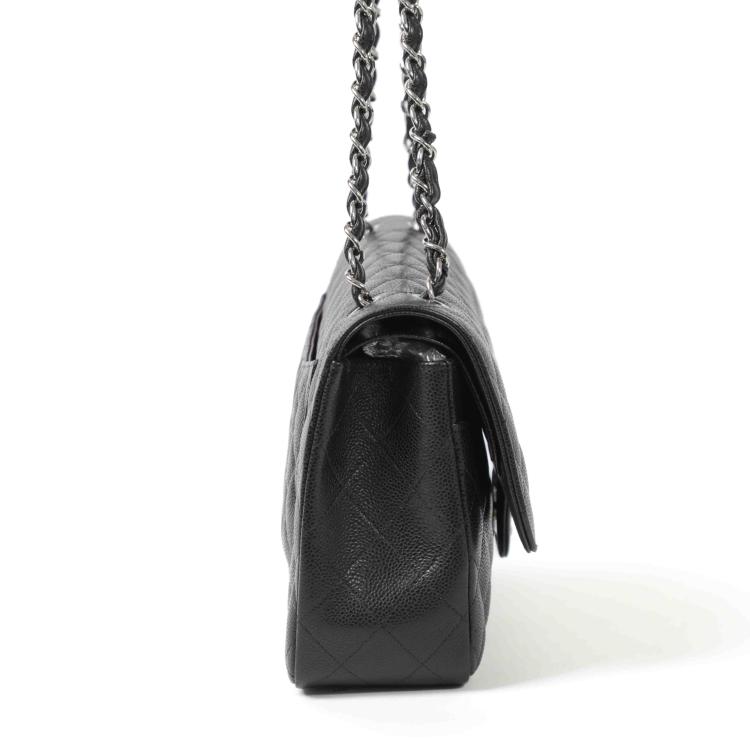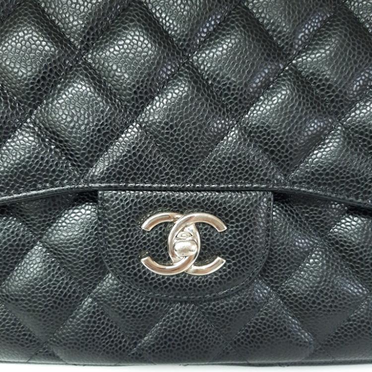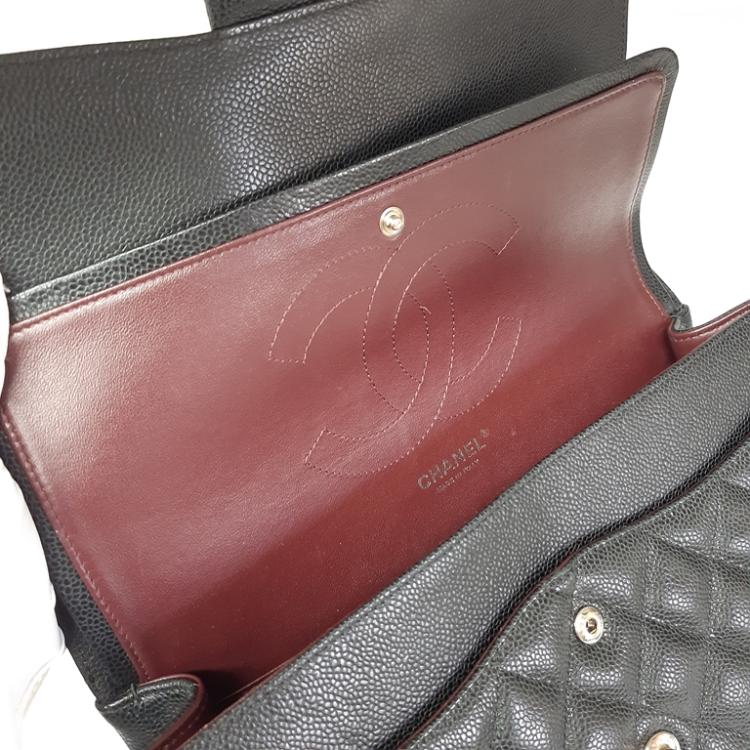 Chanel large double flap in black diamond quilted Caviar with silver-toned hardware (19xxxxxx). Featuring exterior rear pocket, a front flap with a Chanel CC turn-lock. This opens the bag to reveal an inner flap and burgundy leather interior with patched pockets. Approx dimensions: 30cm(L) x 19.5cm(H) x 9cm(D), shoulder chain(doubled) height 34cm. Accompanied by Chanel certificate card, boutique stamp, dustbag, box. With Entrupy Certificate of Authenticity. (Pre-owned)