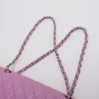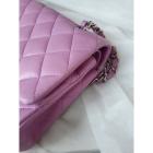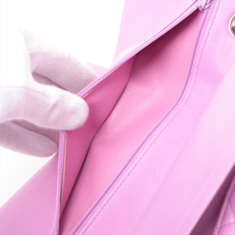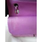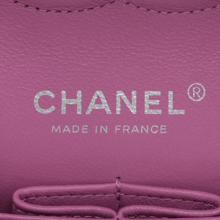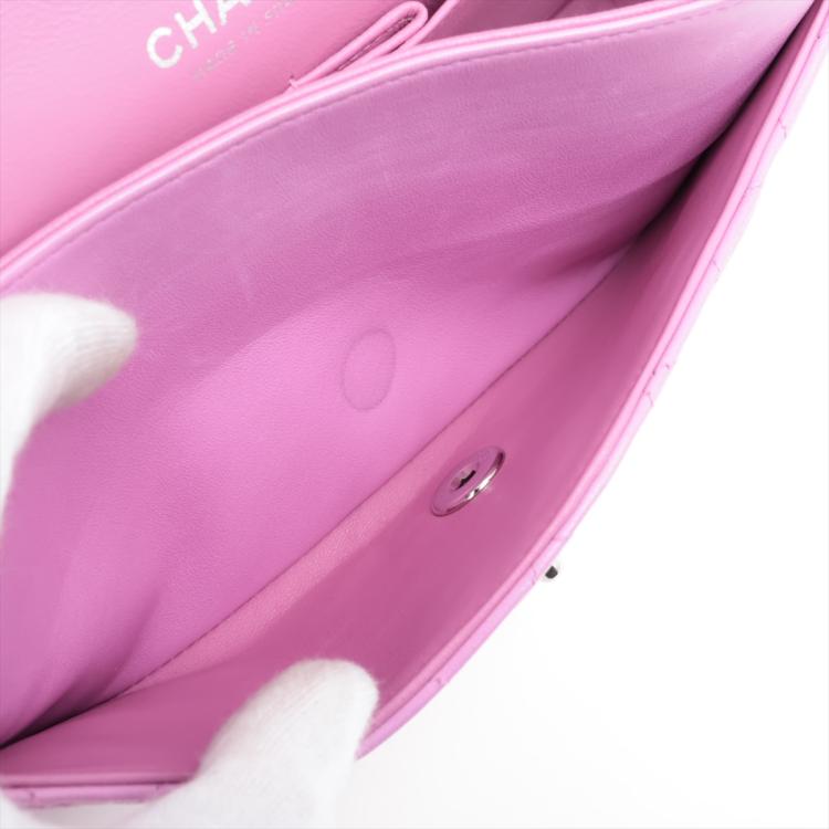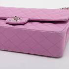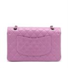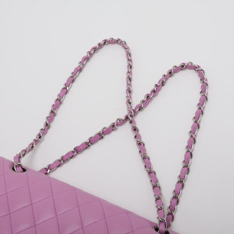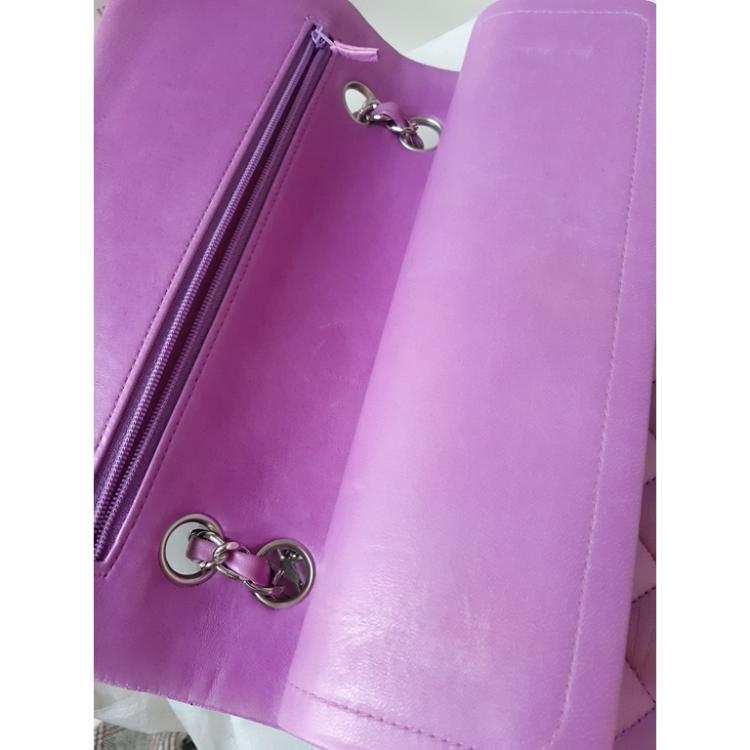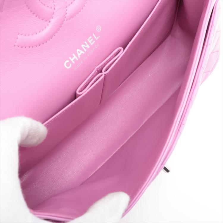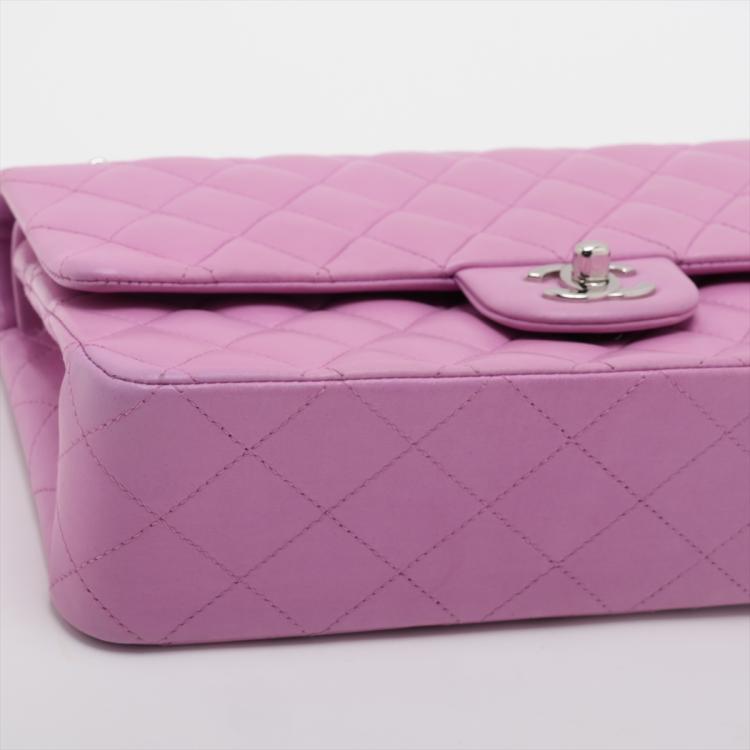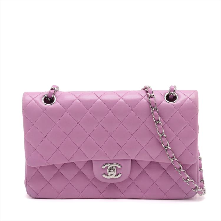 Chanel medium double flap bag in purple, diamond quilted lambskin leather. Featuring silver-toned hardware, an exterior patch pocket at back, frontal flap with Chanel CC turn lock. This opens to reveal an inner flap & a matte purple leather interior with patch pockets. Approx. dimensions: 25cm(L) x 15.5cm(H) x6cm(D), leather-chain doubled strap height: 22.5cm. Accompanied by Chanel certificate card. With Entrupy Certificate of Authenticity. (Pre-owned)