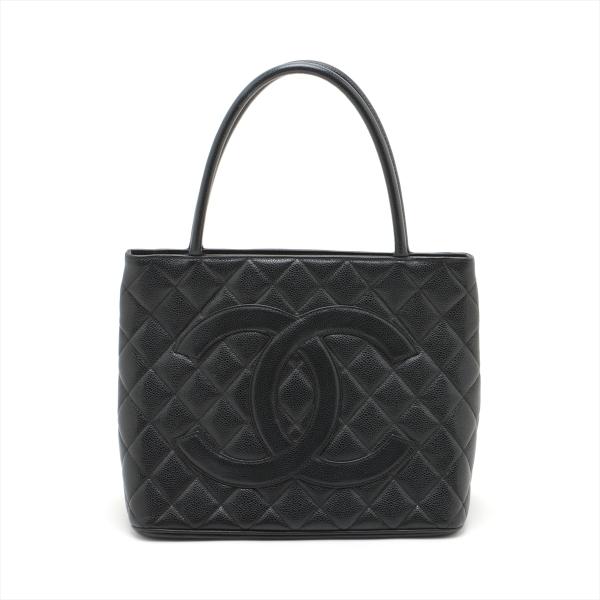 Chanel vintage Medallion tote bag in black diamond quilted Caviar leather. Featuring gold-toned hardware, an exterior patch pocket to the back, dual leather handles, top zipper closure with a Chanel logo plate. This opens to a black leather lining interior with zipper and patch pockets. Approximate dimensions: 30cm(L) x 24cm(H) x 15cm(D), 15cm handle drop. With Entrupy Certificate of Authenticity. (Pre-owned)
