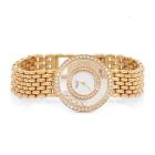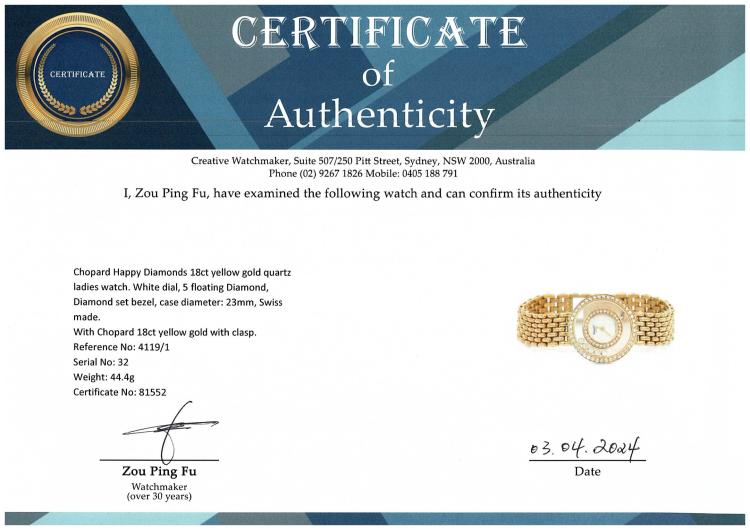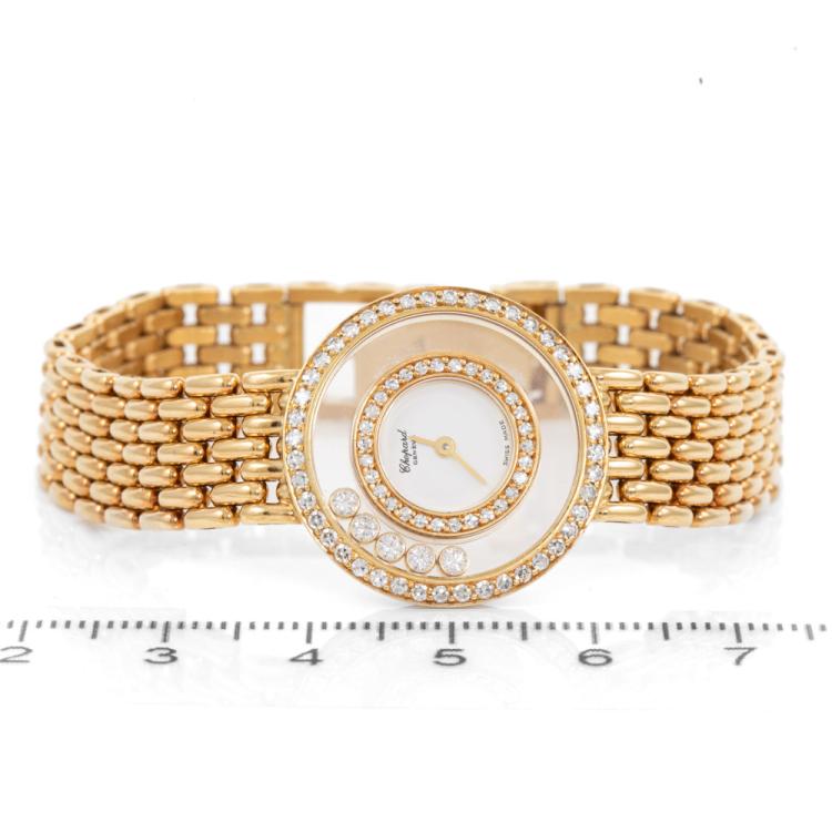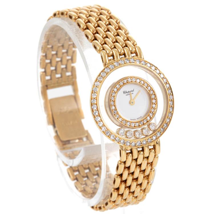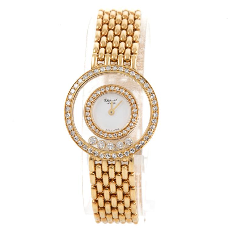 Chopard Happy Diamonds 18ct yellow gold quartz ladies watch. White dial, 5 floating Diamond, Diamond set bezel, case diameter: 23mm, wrist size: 15cm, Swiss made. Ref# 4119/1. With Chopard 18ct yellow gold with clasp. With Certificate of Authenticity. 3 month FSA warranty (Pre-owned)