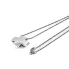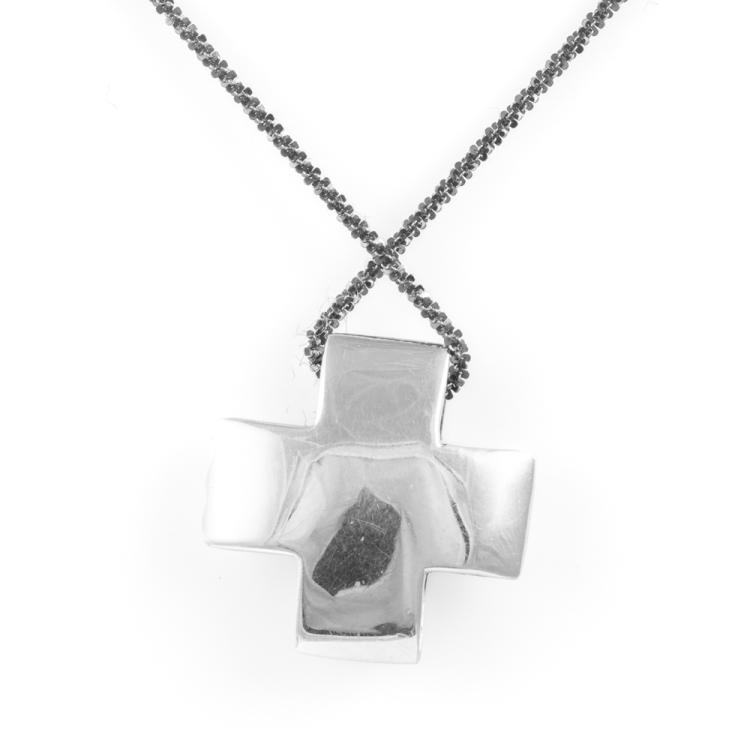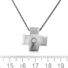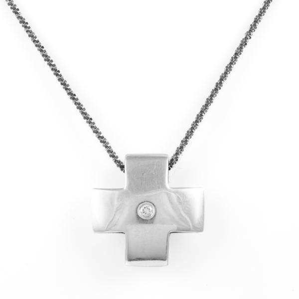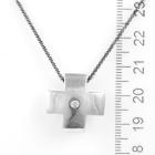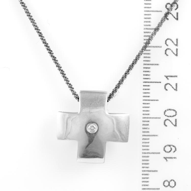 Cross design pendant with a round natural Diamond of approximately 0.04ct. Size: 2cm x 2cm. 18ct white gold with 45cm 18ct gold chain (black rhodium plated). Weight: 8.7g. (Pre-owned)