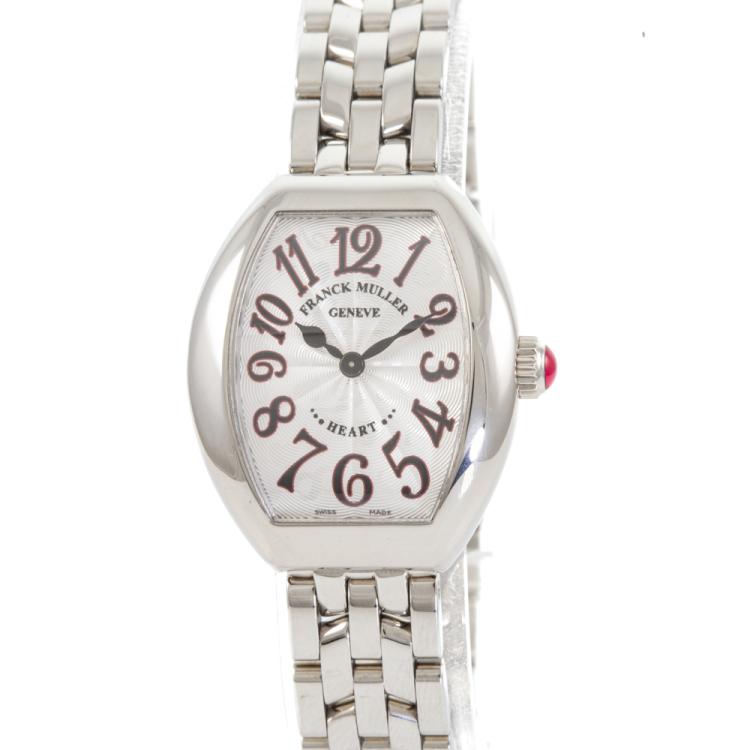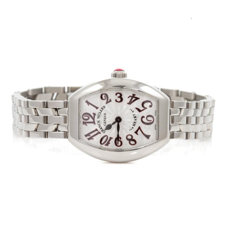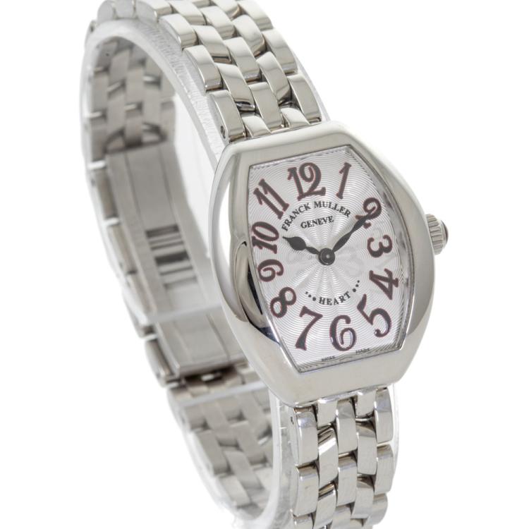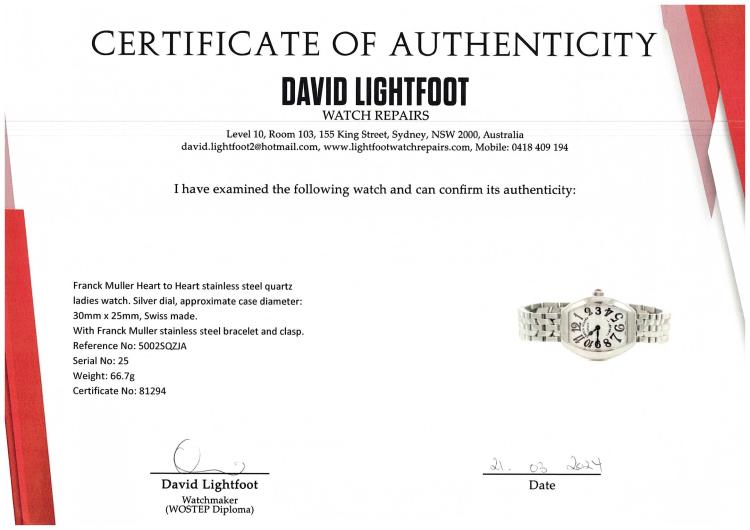 Franck Muller Heart to Heart stainless steel quartz ladies watch. Silver dial, approximate case diameter: 30mm x 25mm, wrist size: 18cm, Swiss made. Ref# 5002SQZJA. With Franck Muller stainless steel bracelet and clasp. With Certificate of Authenticity and Franck Muller box. 3 month FSA warranty (Pre-owned)