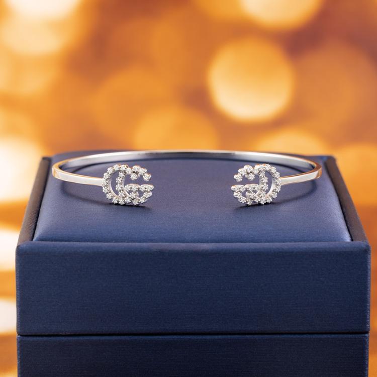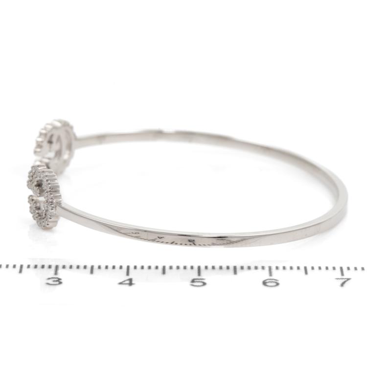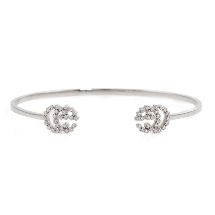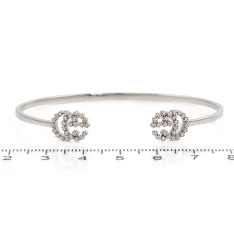 Gucci GG running cuff with round Natural Diamonds totalling 0.10cts. 18ct white gold. Made in Italy. Gucci stamped size 16cm. Band width: 2mm. GG motif size: 7mm x 5mm. Weight: 4.9g. (Pre-owned)