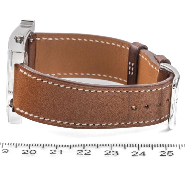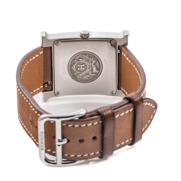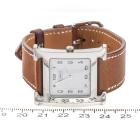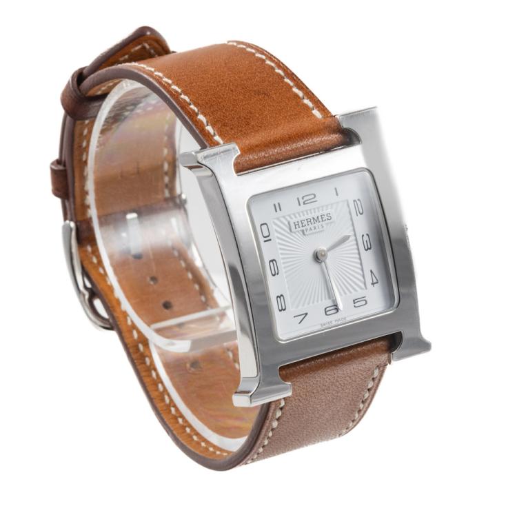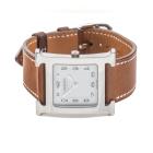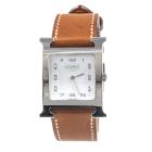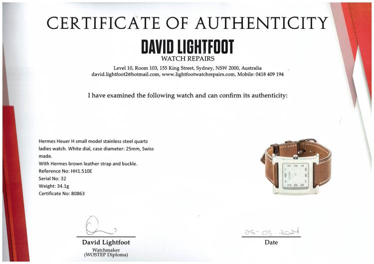 Hermes Heuer H small model stainless steel quartz ladies watch. White dial, case diameter: 25mm, strap length: 18cm, Swiss made. Ref# HH1.510E. With Hermes brown leather strap and buckle. With Certificate of Authenticity. 3 month FSA warranty (Pre-owned)