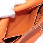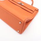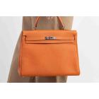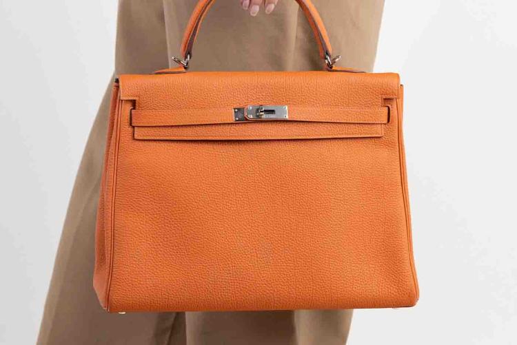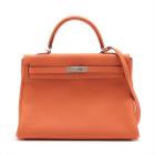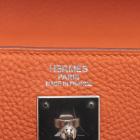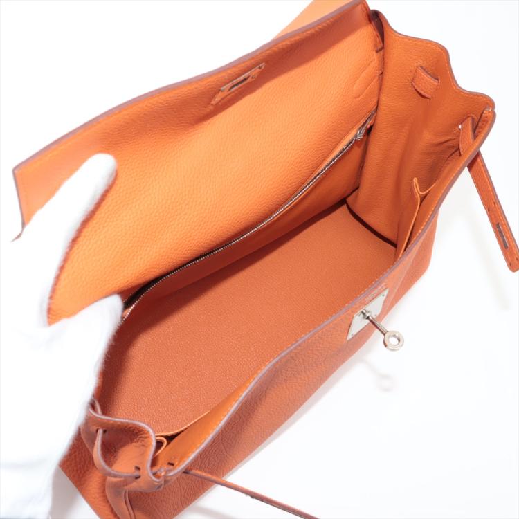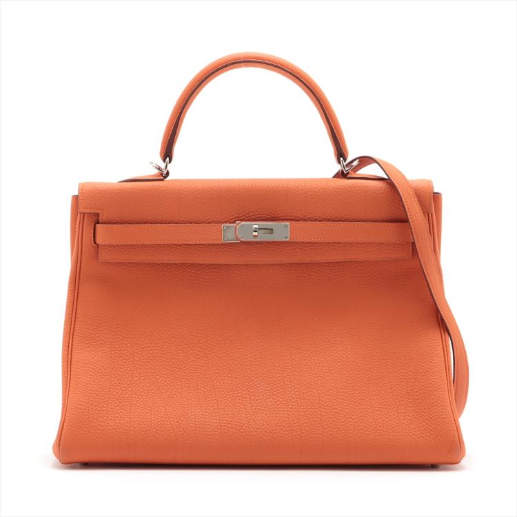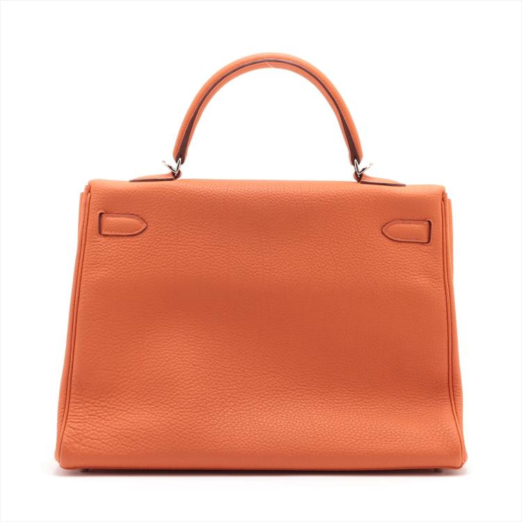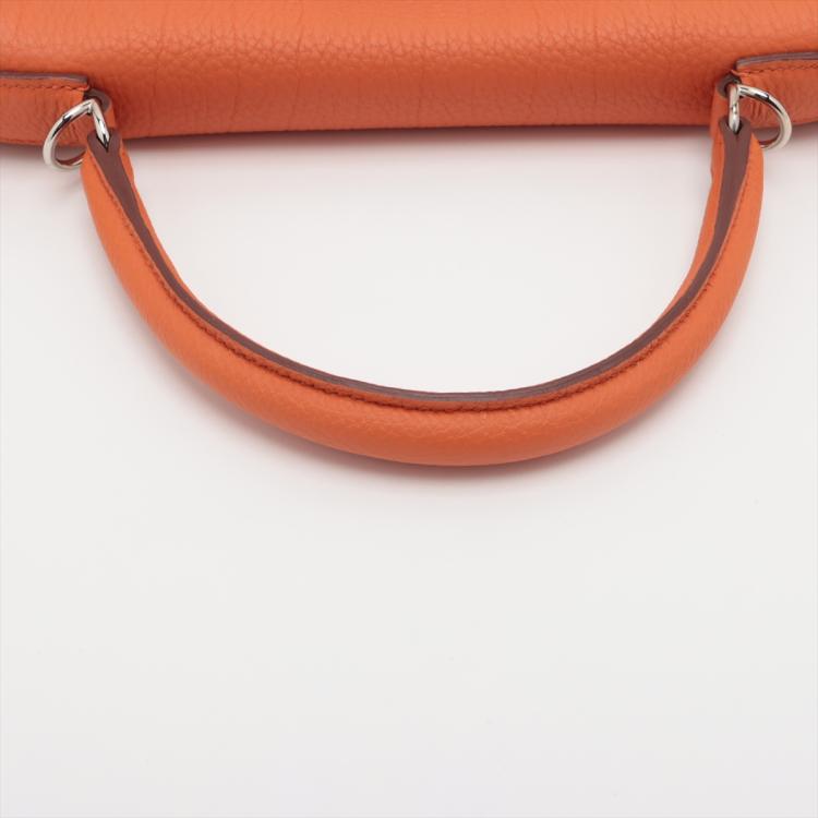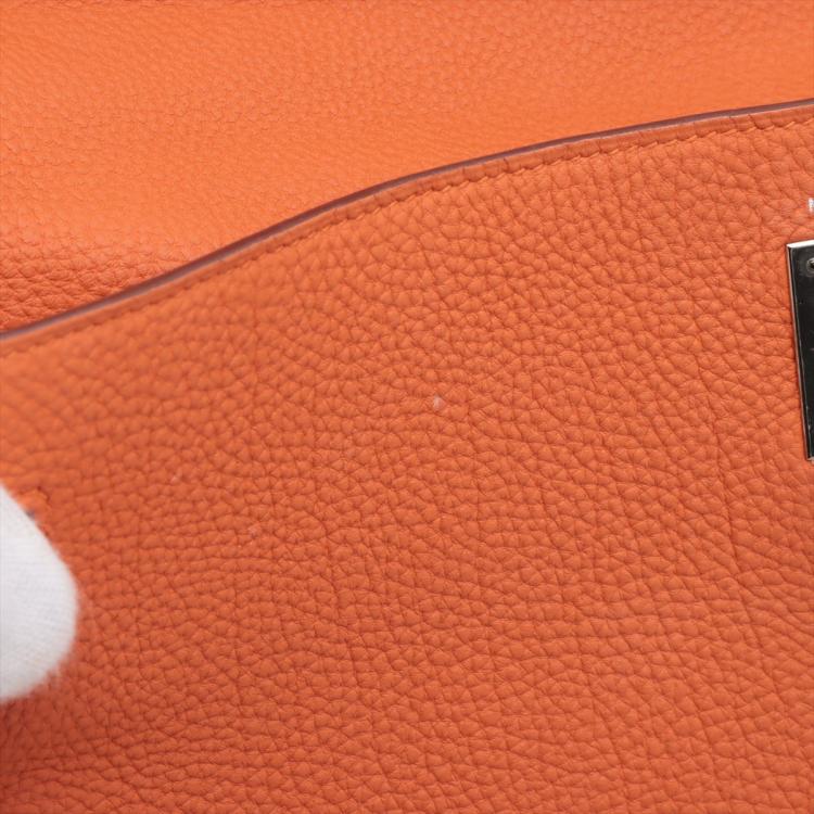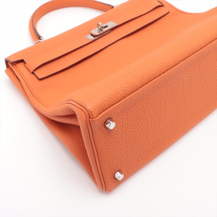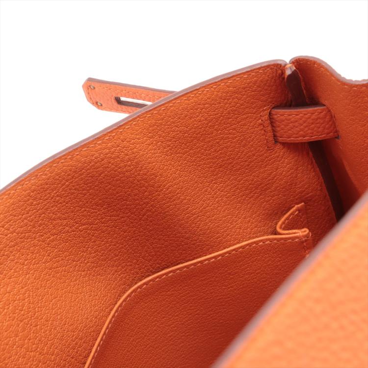 Hermes Kelly 35 in orange Togo leather with silver tone fittings. (Square Q | 2013). Featuring a strap and twist-lock closure that secures the front flap. The matching leather interior contains patched and zipper pockets. Approximate dimensions: 35cm(L) x 24cm(H) x 13cm(D), handle drop: 11cm and strap drop: 44cm.