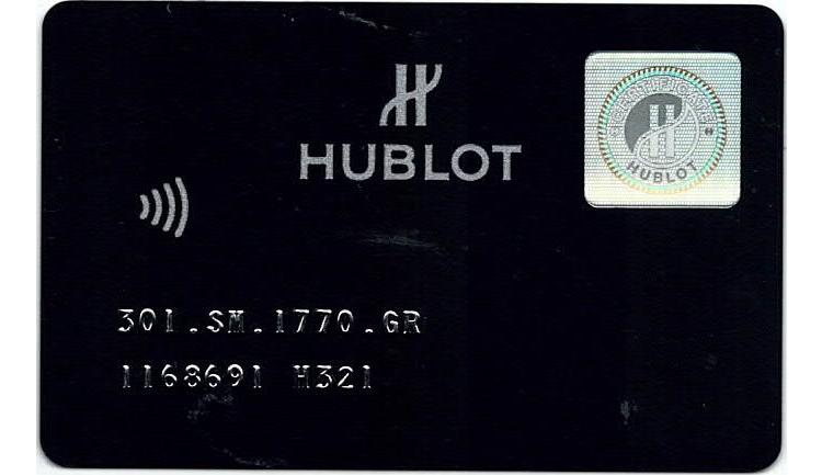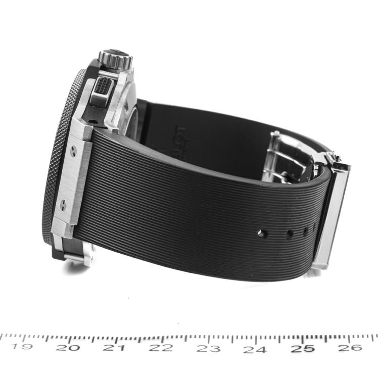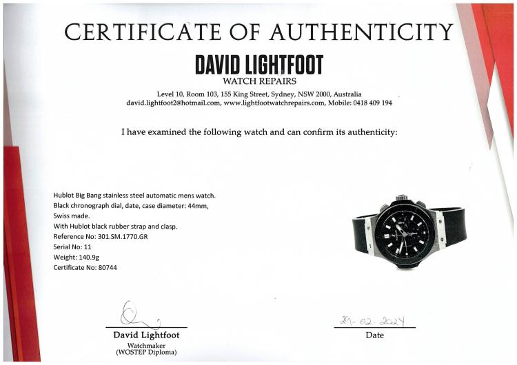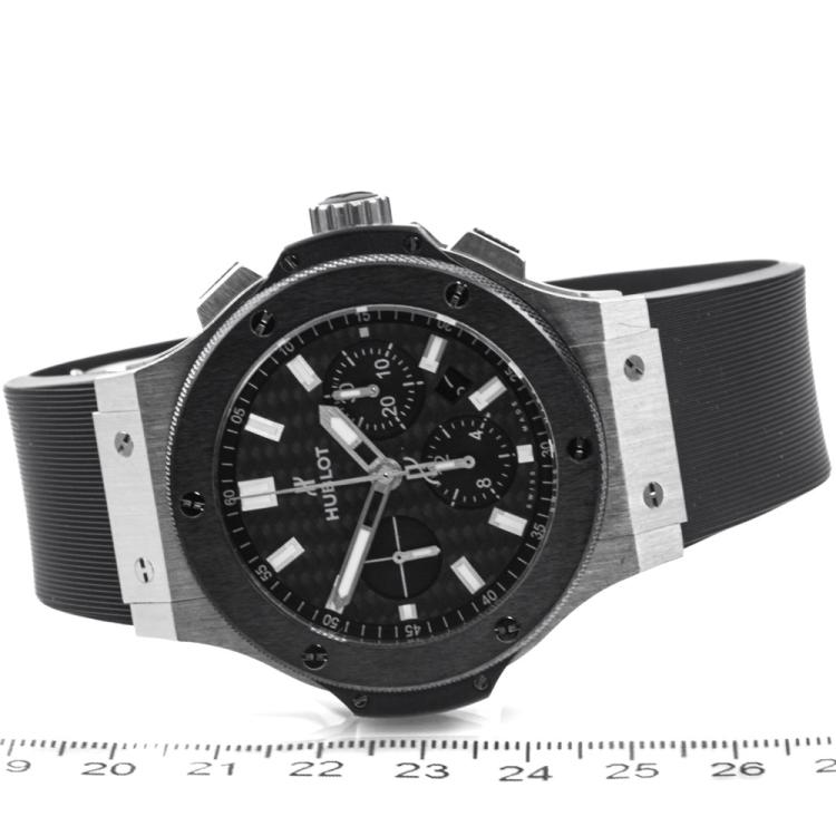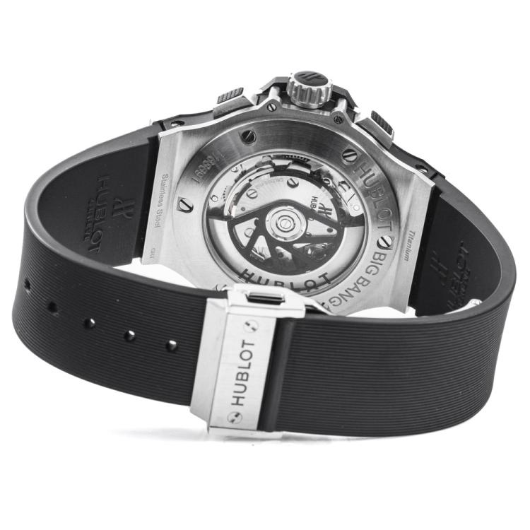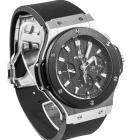 Hublot Big Bang stainless steel automatic mens watch. Black chronograph dial, date, case diameter: 44mm, adjustable max wrist size: 19.5cm, Swiss made. Ref# 301.SM.1770.GR. With Hublot black rubber strap and clasp. With Certificate of Authenticity, Hublot International Warranty card dated 31/08/2016 and Hublot box. 3 month FSA warranty (Pre-owned)
