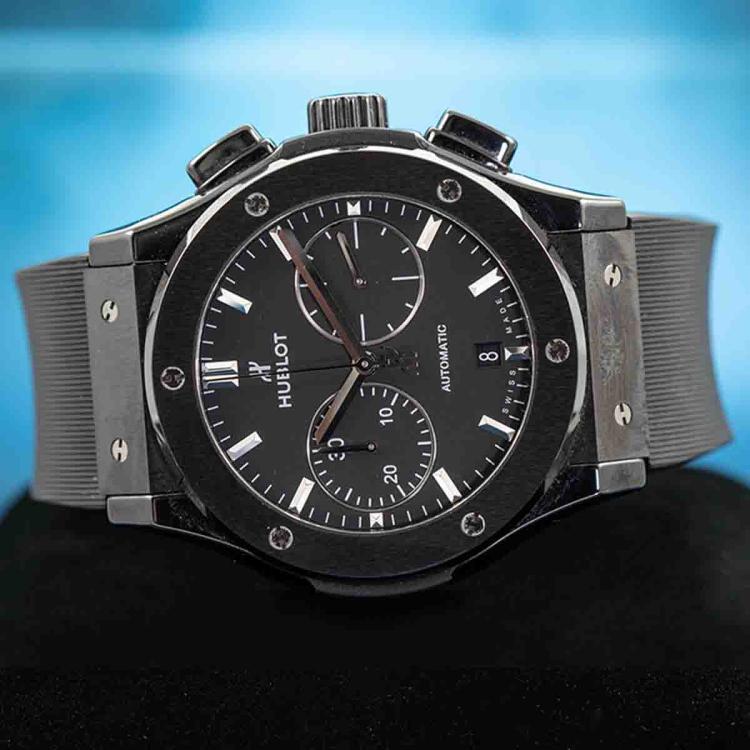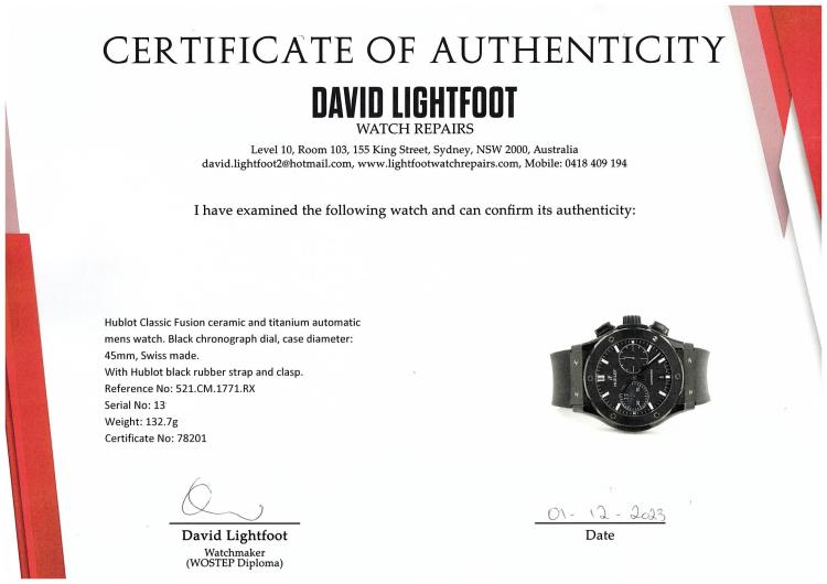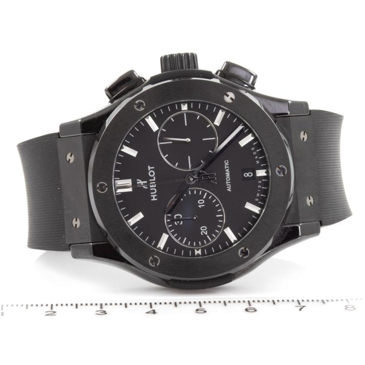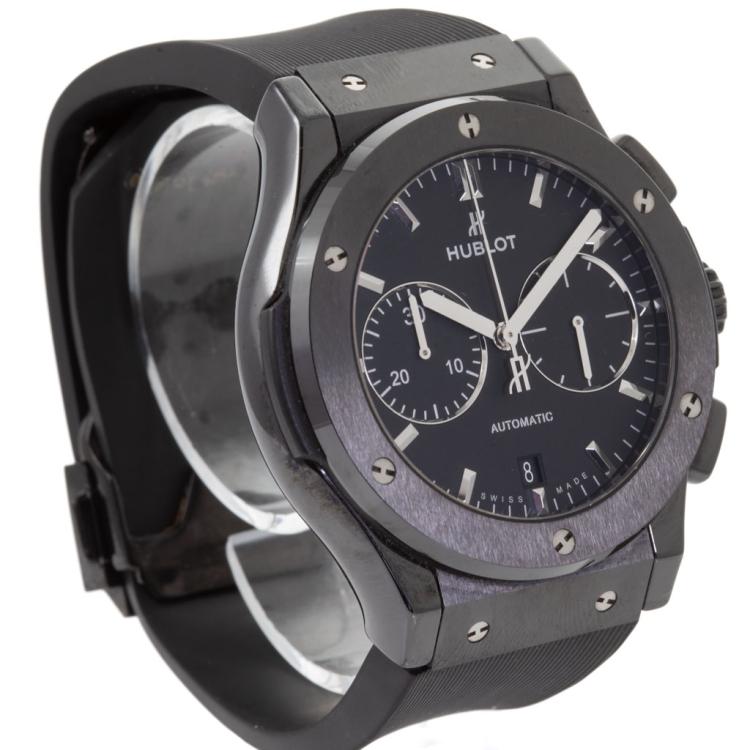 Hublot Classic Fusion Black Magic ceramic and titanium automatic mens watch. Black chronograph dial, date, case diameter: 45mm, adjustable max wrist size: 20.5cm, Swiss made. Ref# 521.CM.1771.RX. With Hublot black rubber strap and clasp. With Certificate of Authenticity. 3 month FSA warranty. (Pre-owned)