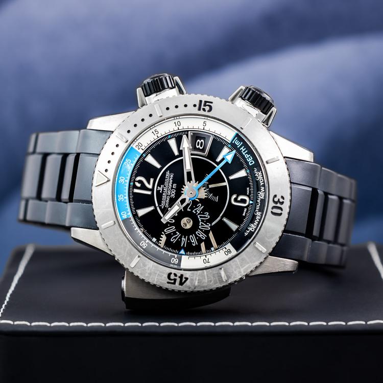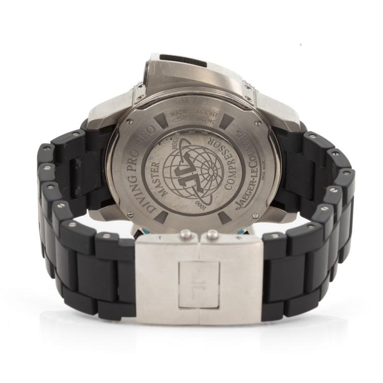 Jaeger LeCoultre Master Compressor Diving Pro Geographic titanium automatic mens watch. Black dial, date, power reserve display, case diameter: 46mm, wrist size: 20cm, Swiss made. Ref# 159.T.39. With Jaeger LeCoultre black rubber bracelet and clasp. With Certificate of Authenticity, Guarantee Certificate booklet dated 13/02/2014 and Jaeger-Le Coultre box. 3 month FSA warranty (Pre-owned)
