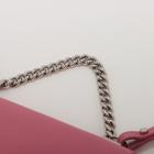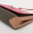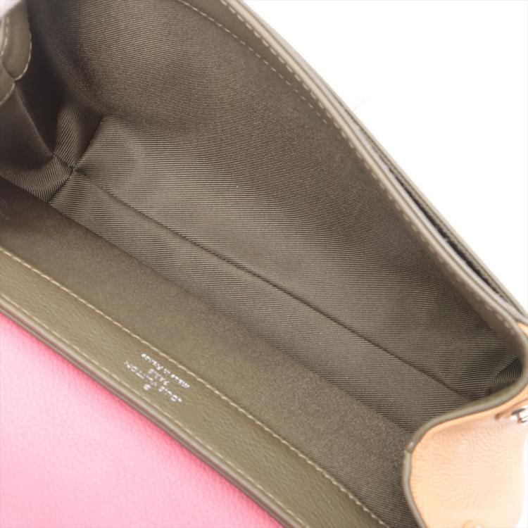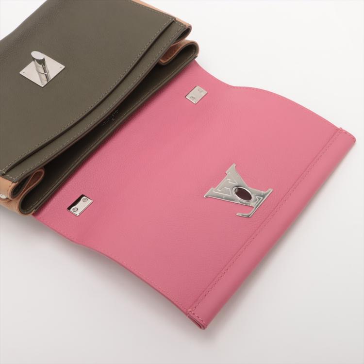Louis Vuitton LockMe II BB in calfskin leather in pink, dark hunter green and beige. Featuring silver tone hardware, chain handle, snap buttons on sides, full flip-over flap with LV logo turned lock closure. It opens to a patch pocket and fabric lining interior. Approximate dimensions: 22cm(L) x 15,5cm(H) x 6.5cm(D), 9cm handle height and 54cm detachable and adjustable strap height. Accompanied by a LV dust bag. With Entrupy Certificate of Authenticity. (Pre-owned)