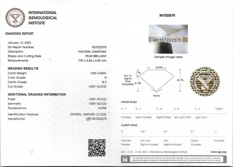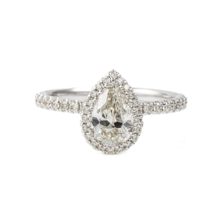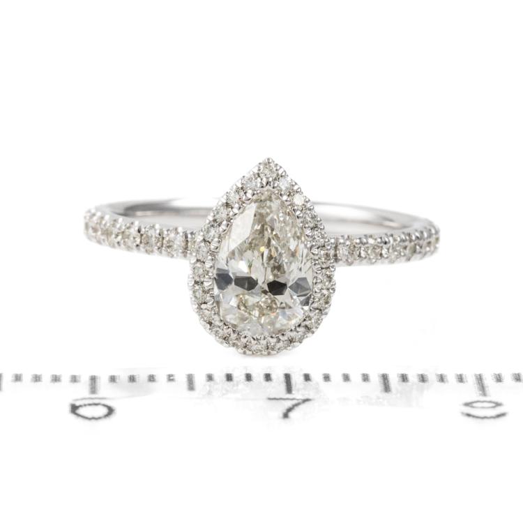 Michael Hill Diamond halo ring with centre pear shape Natural Diamond of 0.90ct (with IGI Diamond report graded as H SI2 #557222575) and rest round Natural Diamonds totalling 0.49cts (Estimated grading: I-K SI2) and ring bridge set with a single pink Natural Sapphire of approximately 0.15ct (under centre Diamond). 18ct white gold. Ring size K. Band width: 1.8mm. Weight: 3.0g. (Pre-owned)