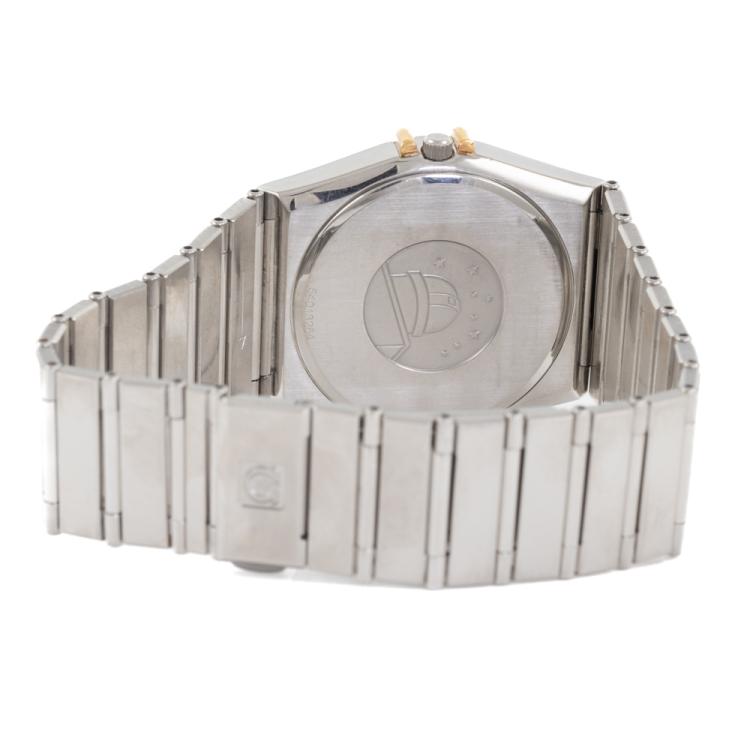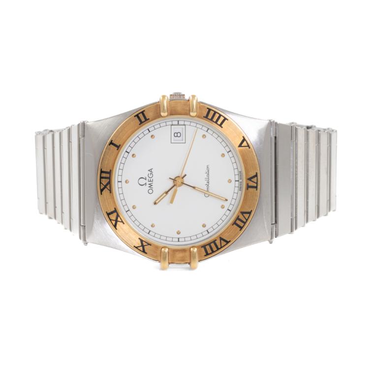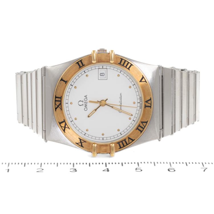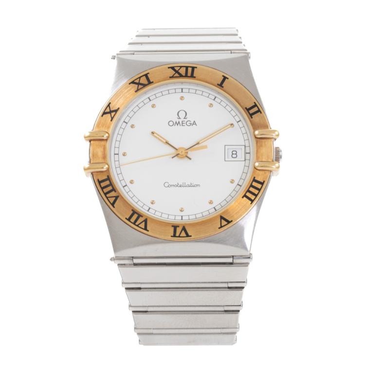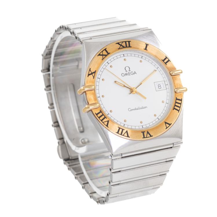 Omega Constellation 18ct yellow gold and stainless steel quartz watch. White dial, date, case diameter: 34mm, wrist size: 17cm, Swiss made. Ref# 396.1070.1. With Omega stainless steel bracelet and clasp. With Certificate of Authenticity. 3 month FSA warranty. (Pre-owned)