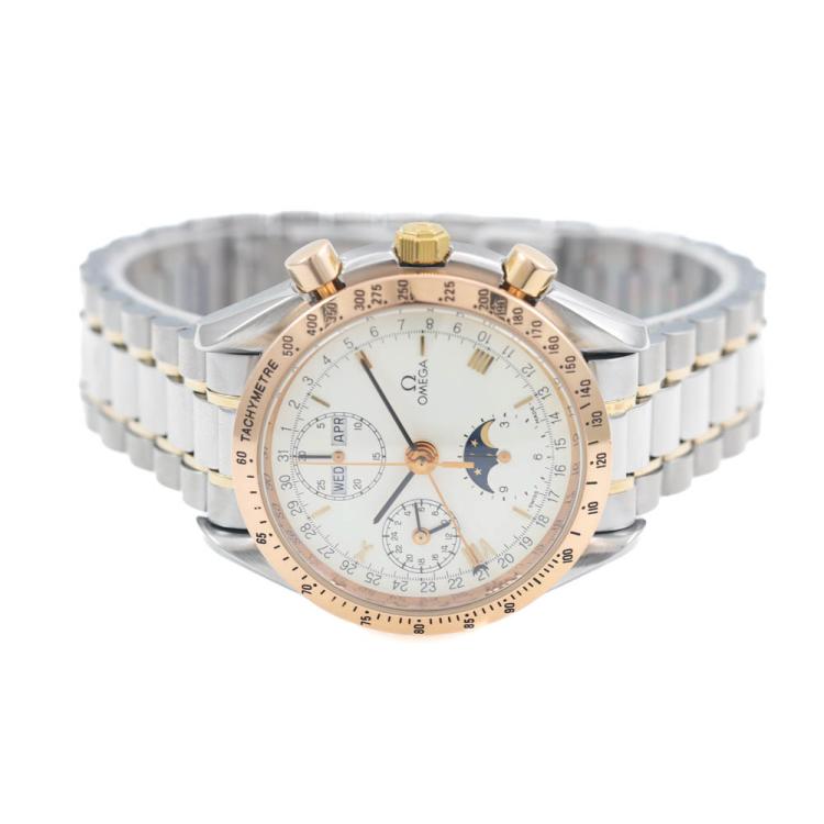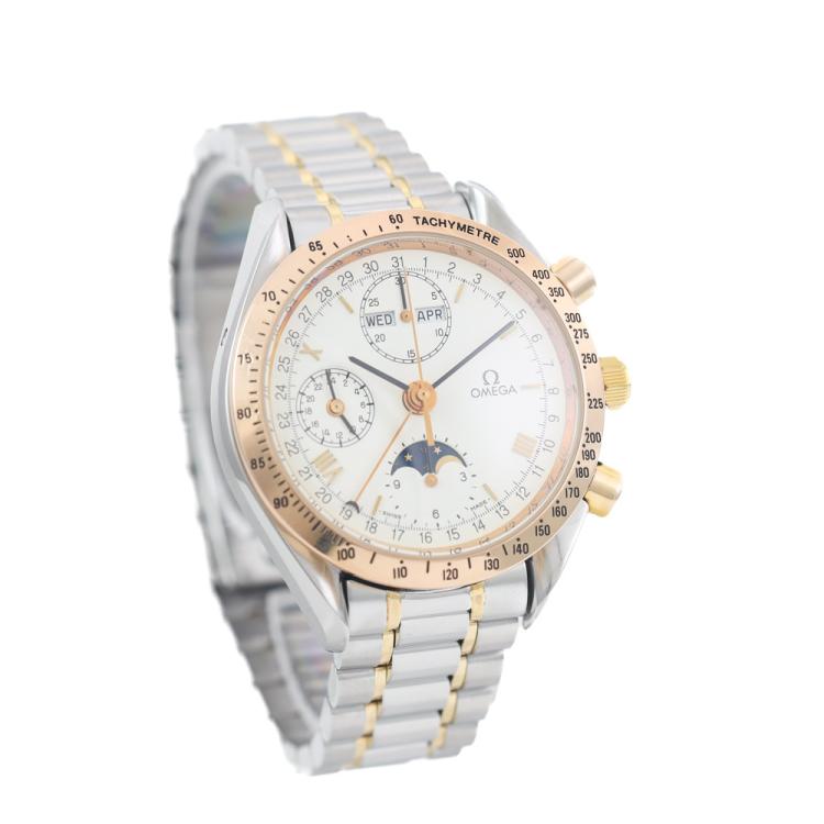 Omega Speedmaster Triple Calendar moonphase 18ct yellow and rose gold and stainless steel automatic mens watch. Ivory chronograph dial, day & date, case diameter: 39cm, wrist size: 18.5cm, Swiss made. Ref# 3336.20. With Omega two-tone bracelet and clasp. With Certificate of Authenticity and Omega box. 3 month FSA warranty. (Pre-owned)