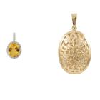 Set of 2 pendants. 1) 9ct yellow gold pendant with size of 3.8cm x 2.0cm. 2) Citrine and Diamond pendant with oval natural Citrine of 1.40ct and round natural Diamonds totalling approximately 0.25ct. 9ct yellow gold. Both no chain provided. Total weight: 7.4g (Pre-Owned)^