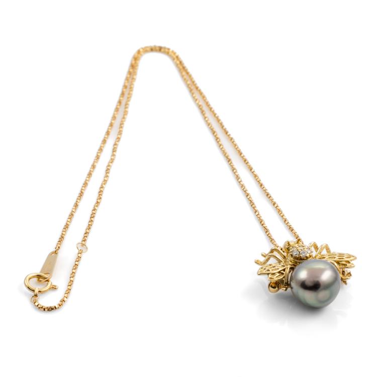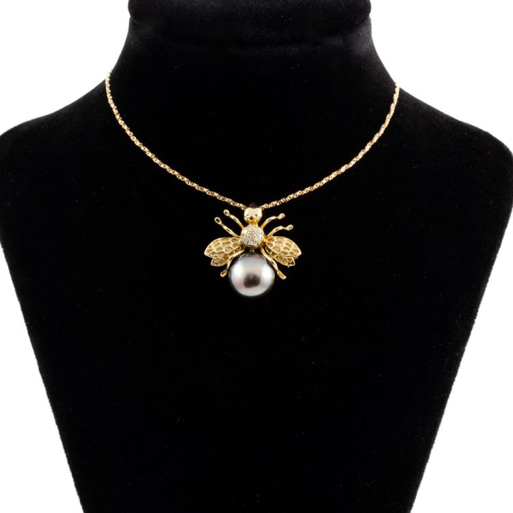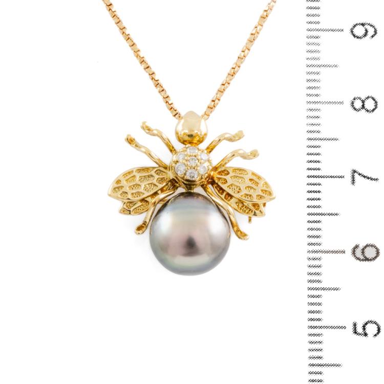 Pearl and Diamond bumblebee pendant/brooch with a Tahitian Pearl of 10.0mm and round natural Diamonds totalling 0.10cts. 18ct yellow gold with 18ct yellow gold chain. Adjustable Length: 37.0 - max 40.0cm. Weight: 7.7g. (Pre-owned)