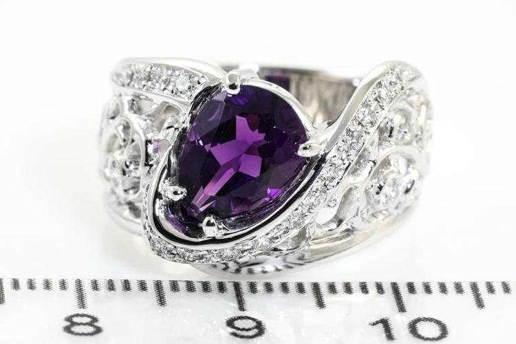 Amethyst and Diamond ring with pear shape Natural Amethyst of 1.70ct and Natural Diamonds totalling 0.25cts. Platinum-900. Ring size M1/2 - cannot be resized up, down with ring clip. Weight: 14.9g (Pre-owned).
