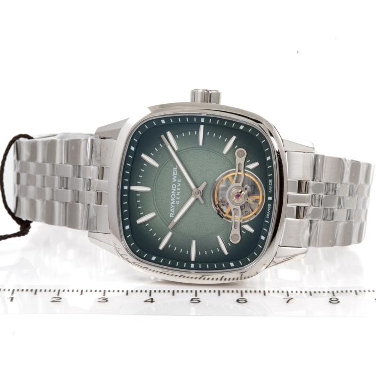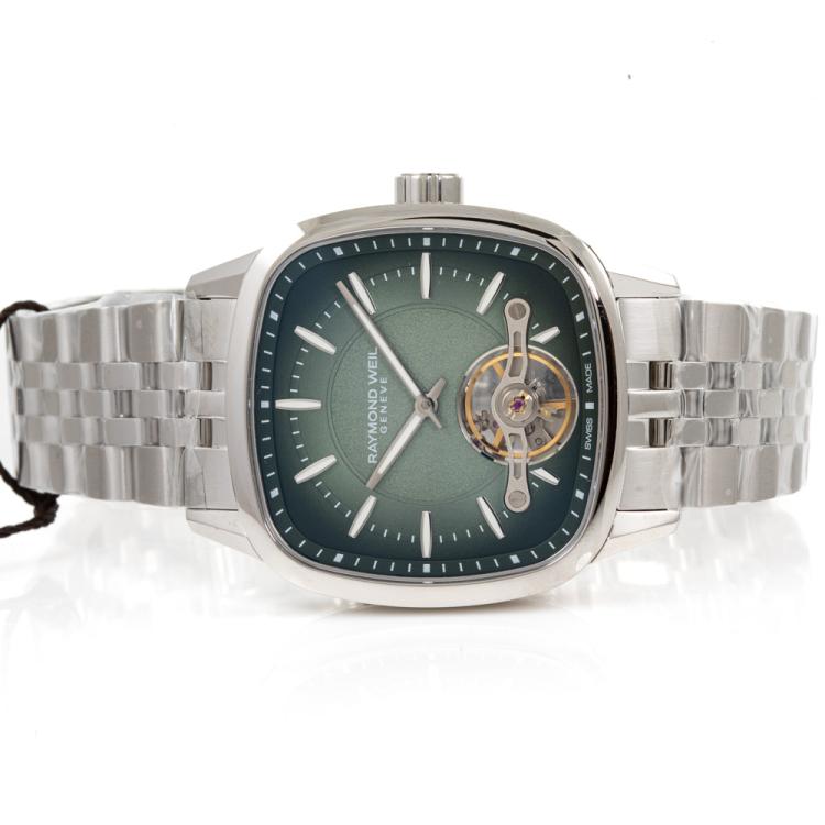 Raymond Weil Freelancer stainless steel automatic mens watch. Green dial, case diameter: 40mm x 40mm. Wrist size: 21cm, Swiss made. Ref# 2790-ST-52051. With Raymond Weil stainless steel bracelet and clasp. With Raymond Weil Guarantee card and Raymond Weil box. 12 month FSA warranty (AS new, Note: case and bracelet in original wrapping)